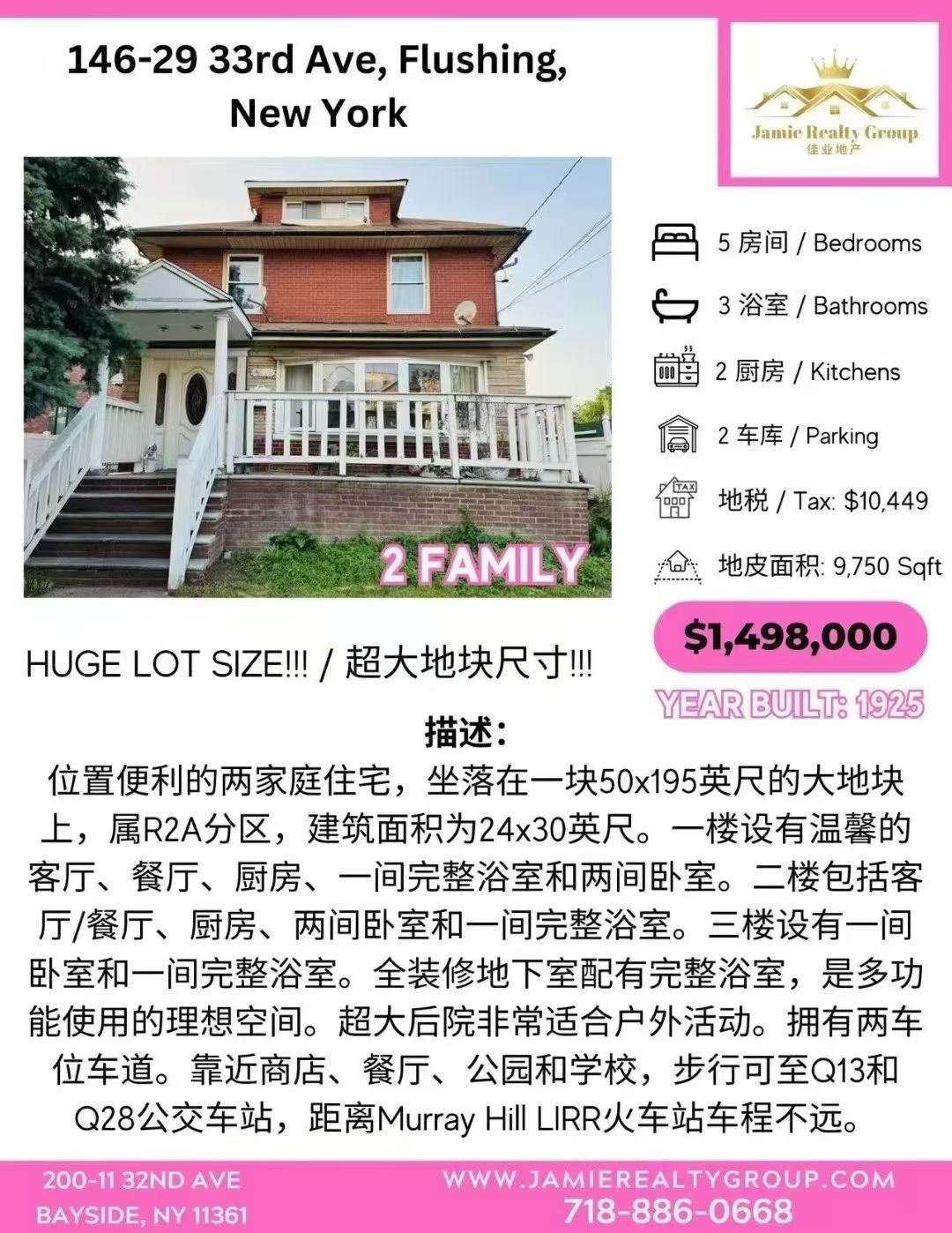 🌹法拉盛重回市場🌹50x195地, 法拉盛两家庭出售
