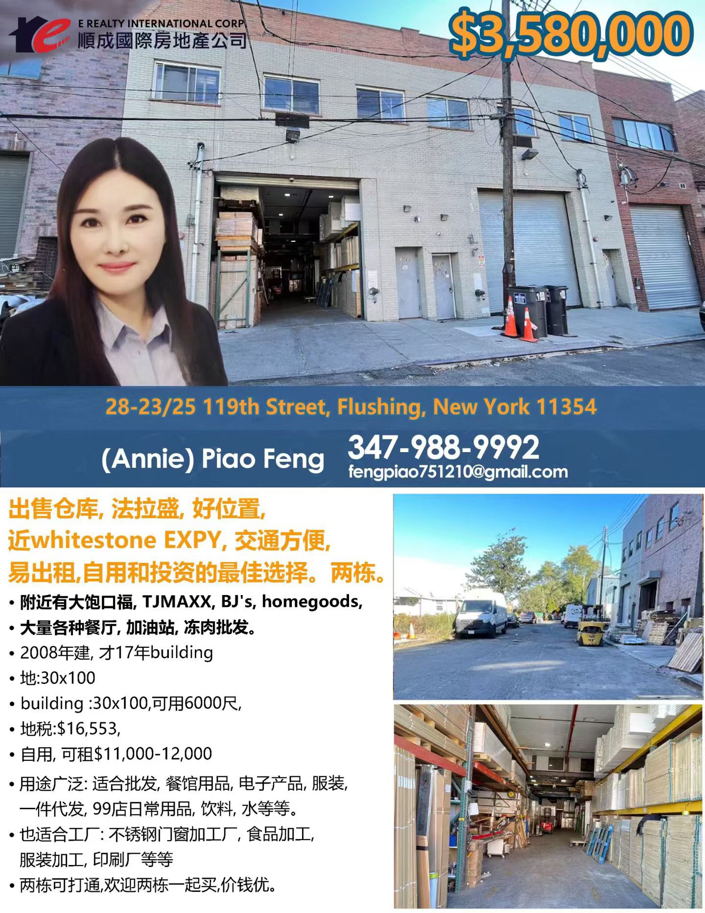 出售仓库,法拉盛,好位置,近whitestone EXPY,交通方便,附近有大饱口福。TJMAXX,BJ's,homegoods,大量各种餐厅,加油站,冻肉批发。易出租,自用和投资的最佳选择。两栋。