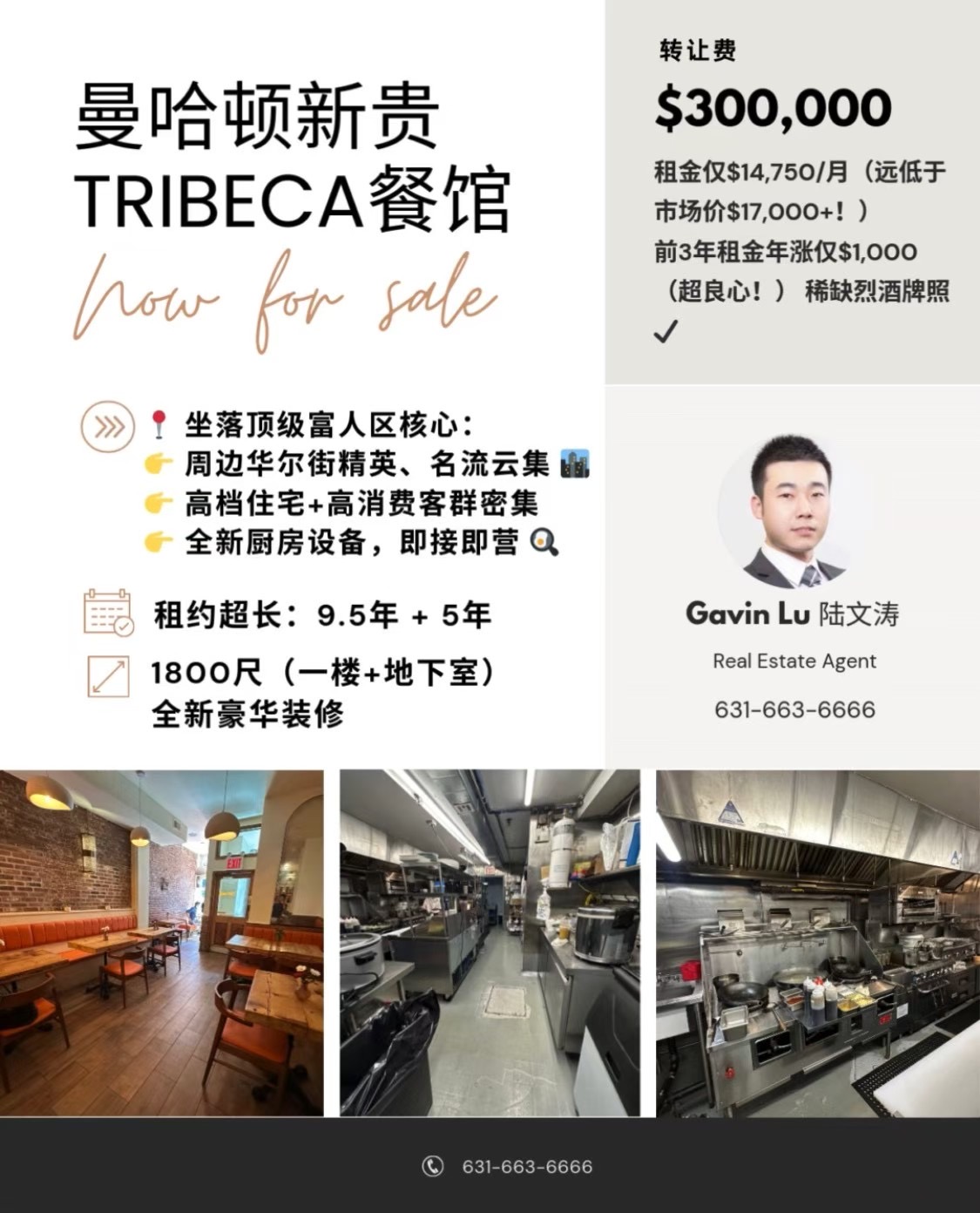🆕【曼哈顿Tribeca黄金地段餐馆转让🔥】$30万