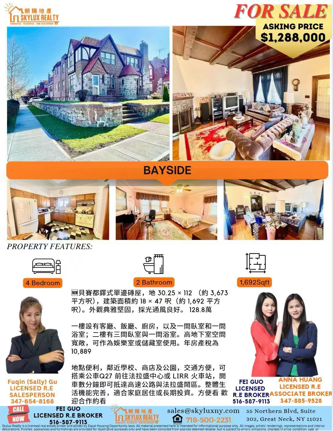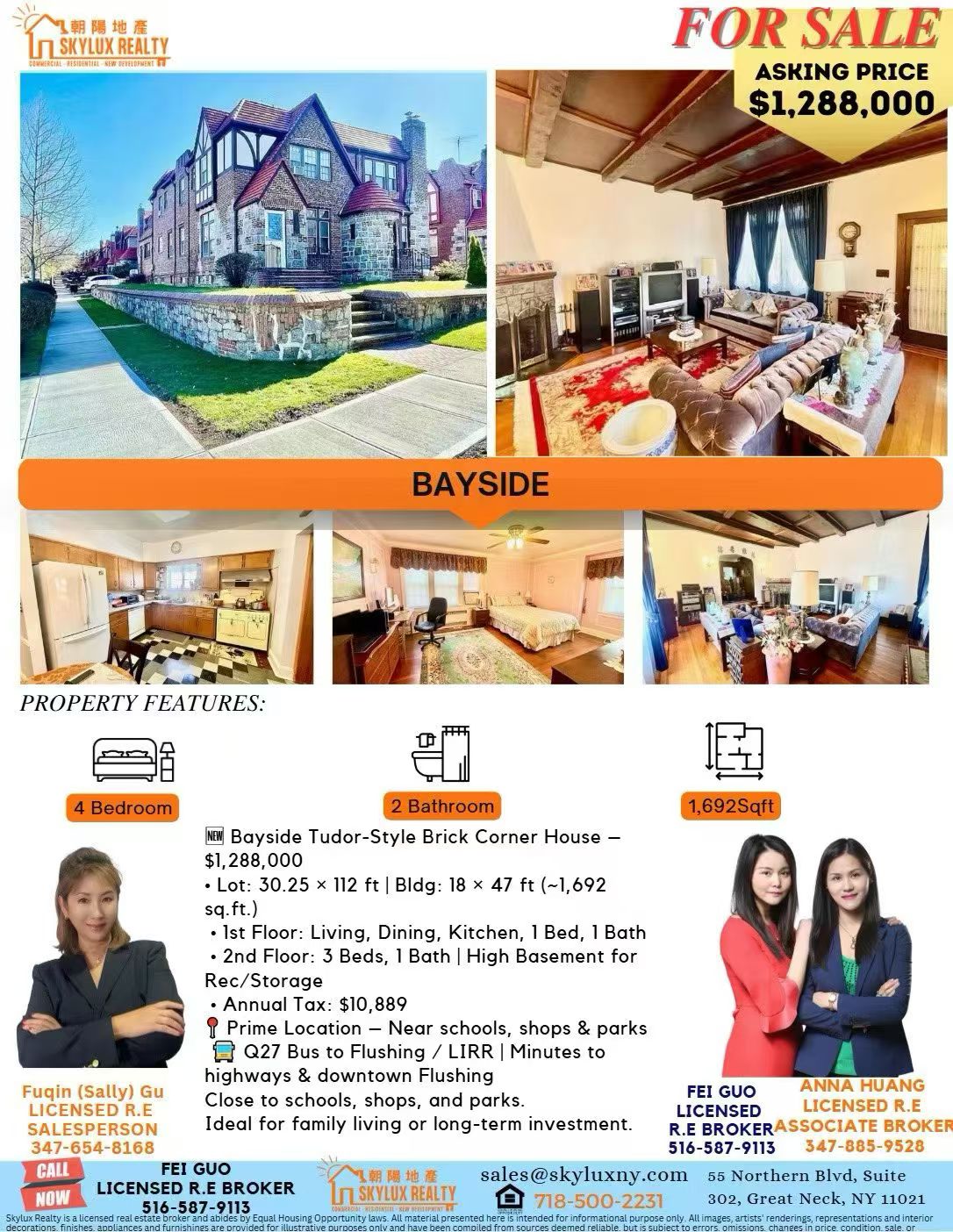 地點便利,鄰近學校、商店及公園,交通方便,可搭乘公車Q27 前往法拉盛中心或 LIRR 火車站,開車數分鐘即可抵達高速公路與法拉盛鬧區。整體生活機能完善,適合家庭居住或長期投資。方便看 歡迎合作約看 ☎️5165879113 Anna & Fay Team