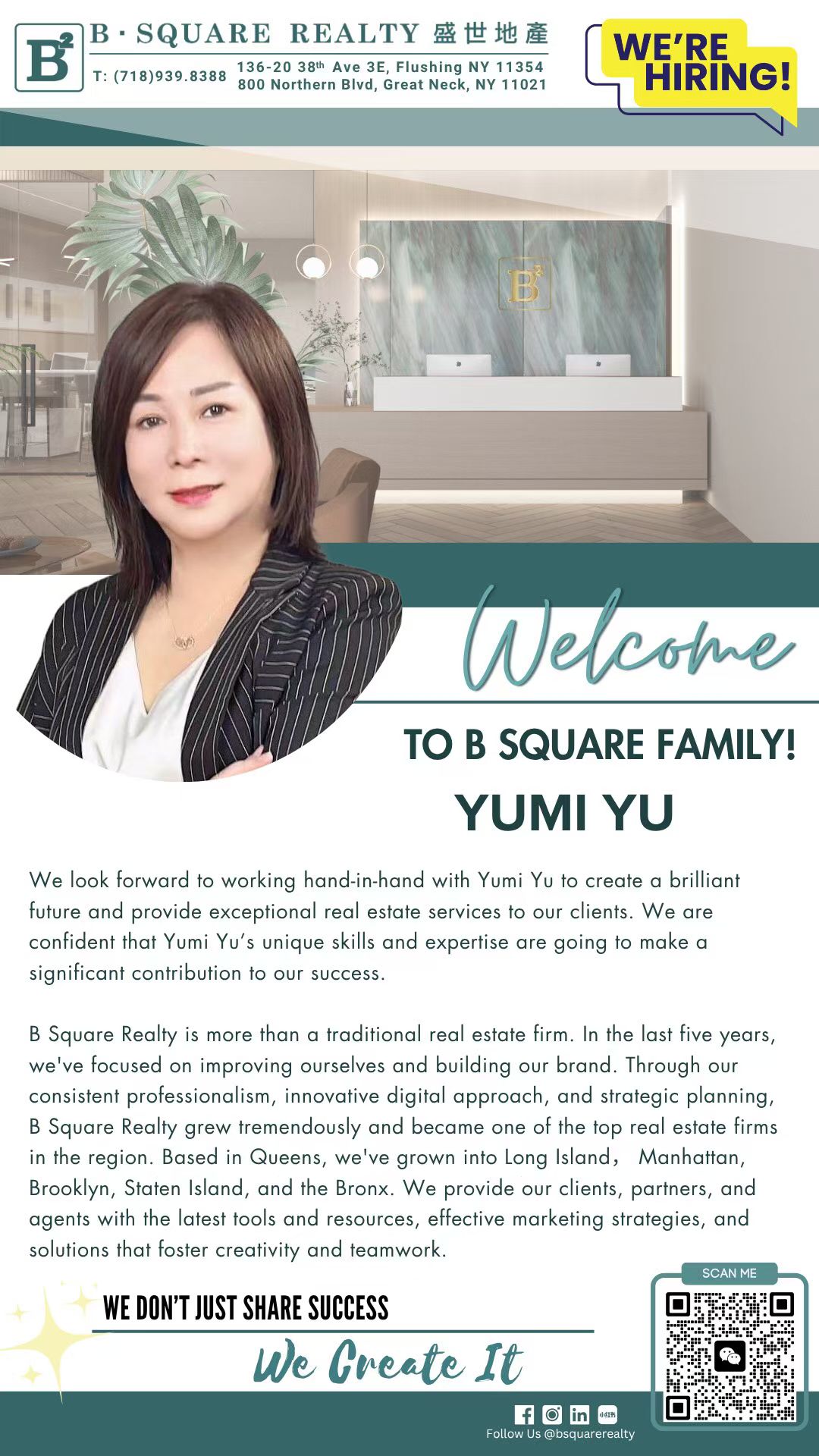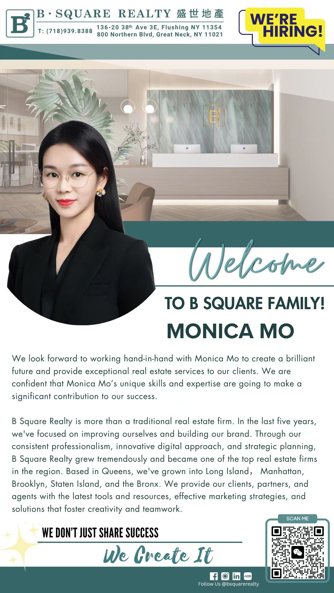 欢迎Monica、Yumi & David加入B Square Realty,开启他们的房地产事业新篇章。与盛世精英,共同创造非凡未来。B Square Realty,一个不断创新、专注成长的房地产领航者,覆盖纽约多个区域,提供前沿的工具和资源,助您成就业务卓越。