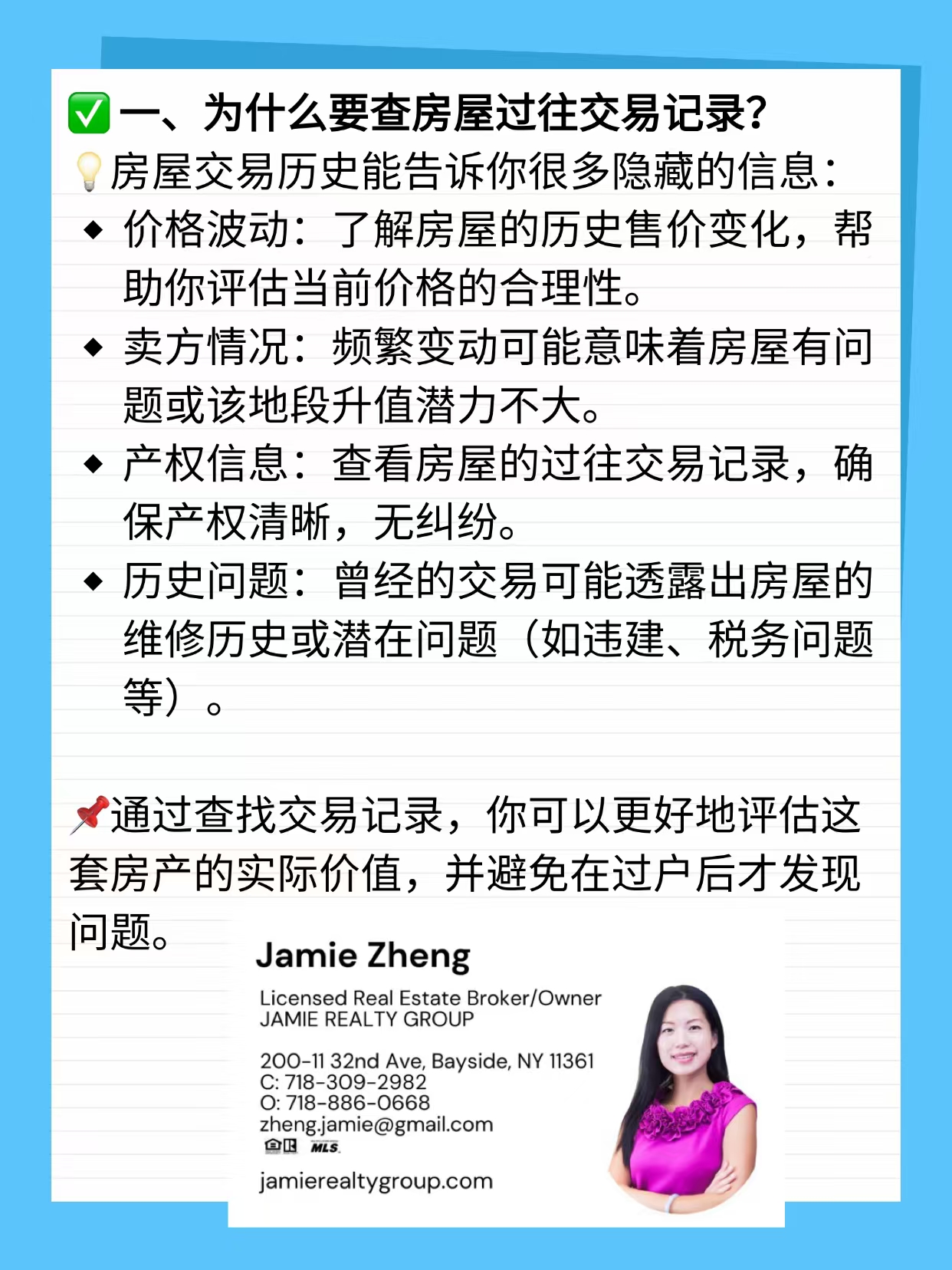 在纽约买房,许多买家往往只关注房屋的外观、户型以及价格,却忽略了一个关键因素——房屋的过往交易记录。事实上,了解房屋历史交易情况,可以帮助买家判断房产的真实价值、潜在风险,以及未来升值潜力,是避免买房踩雷的重要步骤。