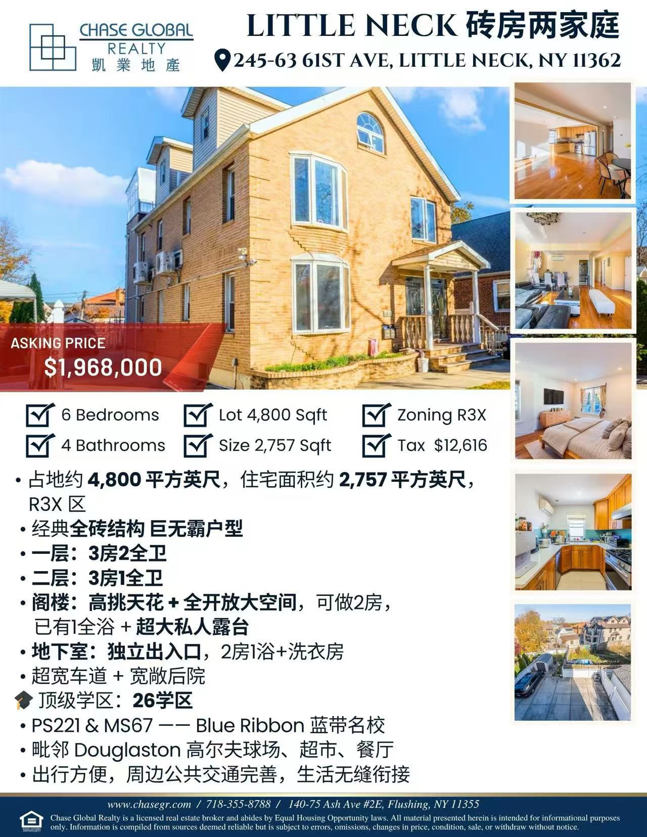 Little Neck 稀缺好房 大型 巨无霸 两家庭住宅 |地约4800尺|居住面积2757尺|R3X分区