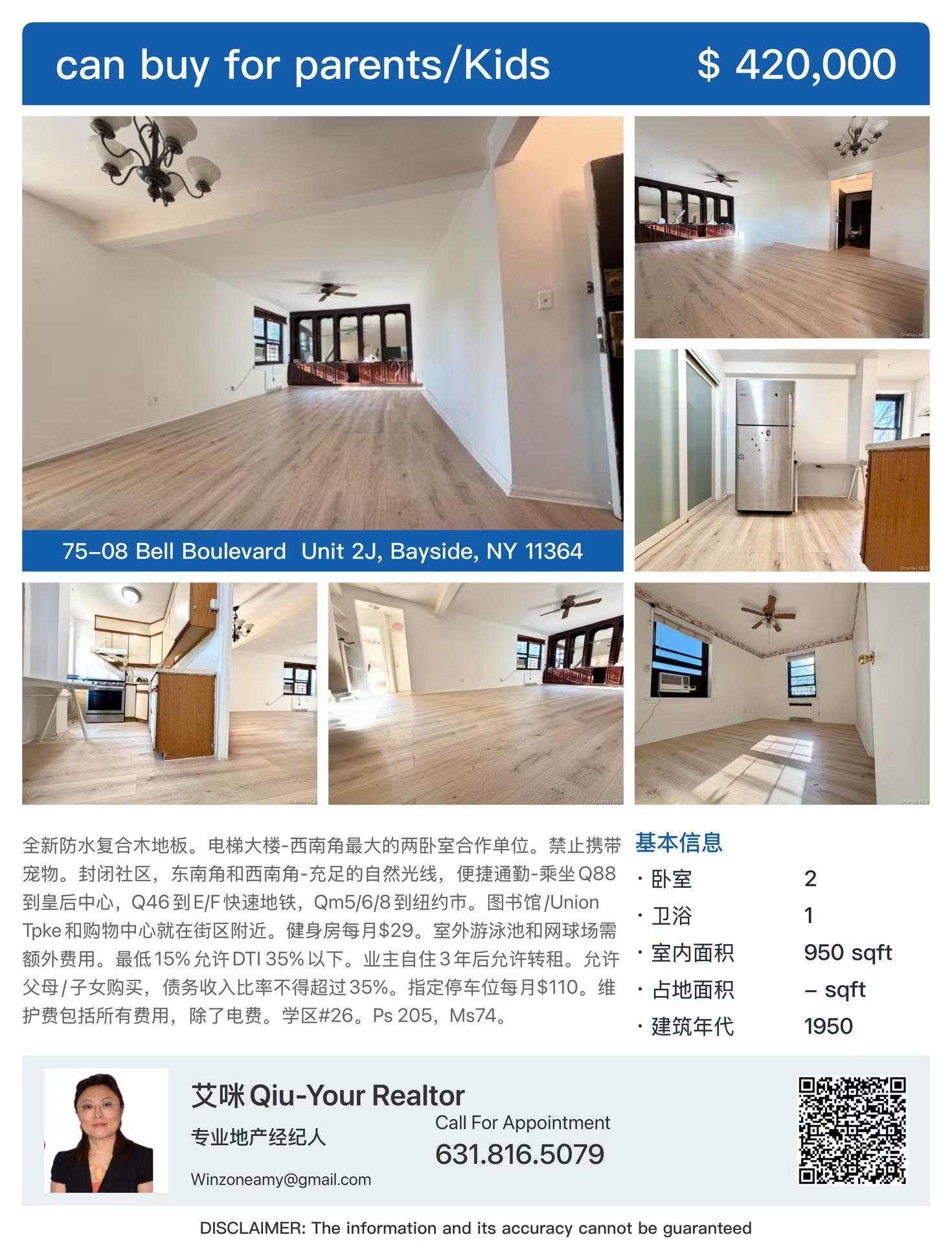 全新防水复合木地板。电梯大楼-西南角最大的两卧室合作单位。禁止携带 基本信息宠物。封闭社区,东南角和西南角-充足的自然光线,便捷通勤-乘坐Q88到皇后中心,Q46到E/F快速地铁,Qm5/6/8到纽约市。图书馆/UnionTpke 和购物中心就在街区附近。健身房每月$29。室外游泳池和网球场需额外费用。最低15%允许DTI 35%以下。业主自住3年后允许转租。允许父母/子女购买,债务收入比率不得超过35%。指定停车位每月$110。维•占地面积护费包括所有费用,除了电费。学区#26。Ps 205,Ms74。