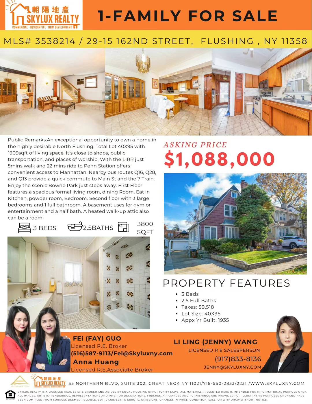 位于法拉盛25学区, 周围环绕着商店, 公共交通和宗教场所. LIRR仅有5个街区之遥,到Penn Station车程仅22分钟, 轻松抵达曼哈顿.步行可抵达Bowne Park, 方便散步及亲子活动.