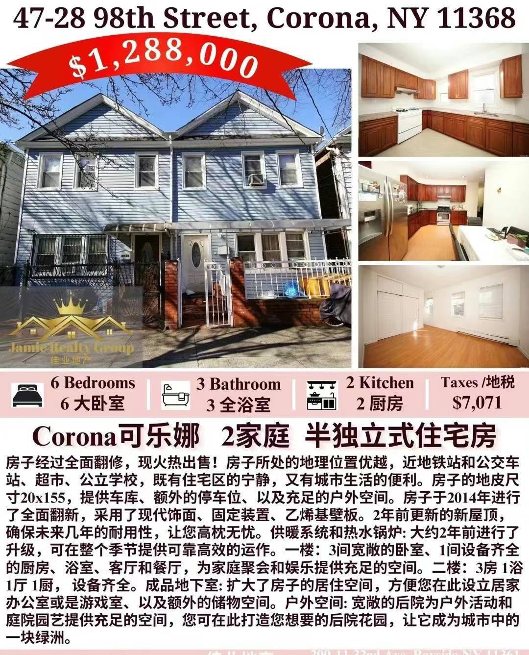 Corona 单边靠近公交车站、超市和公立学校。占地20x155,这处房产提供了充足的户外空间和2车位车库的奢华,另外还可轻松停放额外4辆车。新屋顶安装:享受内心的平静,屋顶2年前更换,全面翻新:2014年全面翻新,此家庭住宅已用现代化的饰面和装置更新,大约2年前,供暖系统和热水锅炉进行了升级,一楼设有三间宽敞的卧室、全套厨房、浴室、客厅和餐厅,二楼设有三间卧室、客厅、浴室和厨房。完成的地下室:完成的地下室,分开进出,位于步行距离内的必要设施和公共交通, 房子18x58, 地税$7071