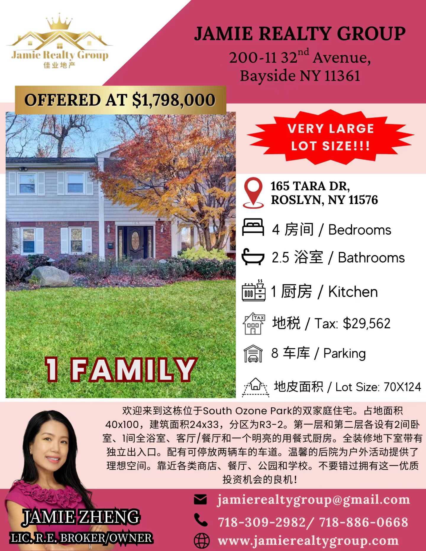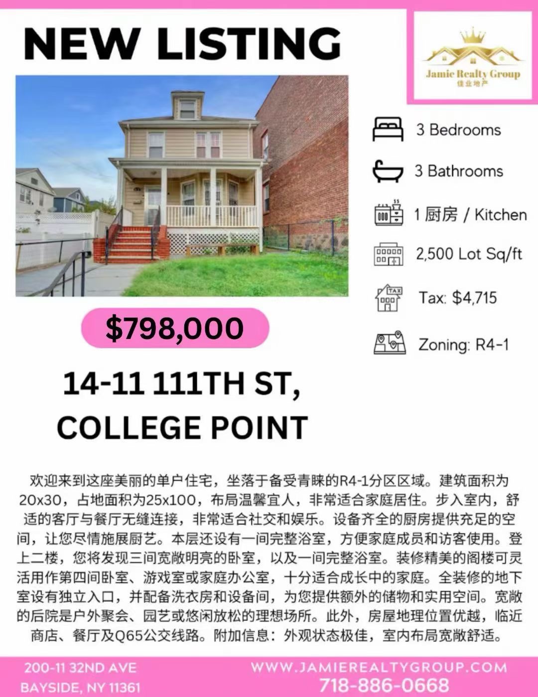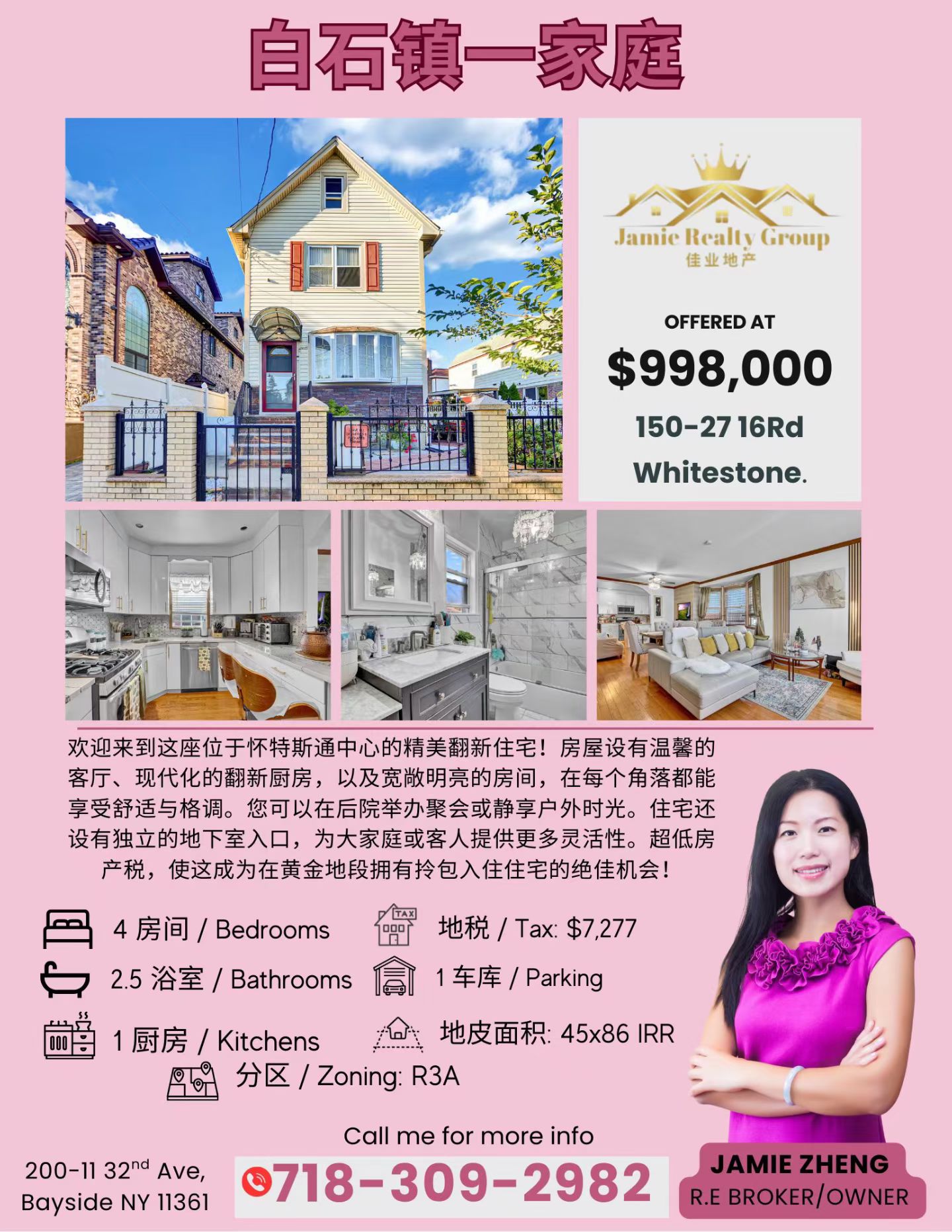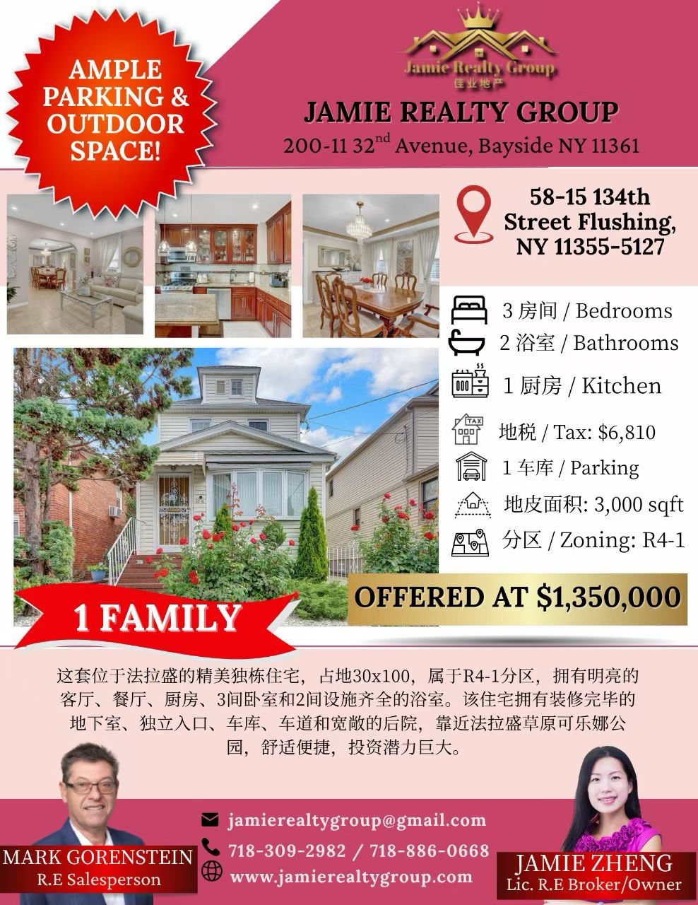 欢迎来到这栋位于法拉盛的精美独立住宅。房屋建筑面积为30X40,地尺寸为40.5X140.67,R2A分区。首层设有明亮宽敞的客厅、正式餐厅、厨房、办公室及一间全浴室。二层为宽敞的主卧套房,配备独立全浴室。全装修地下室带洗衣房。宽敞的后院为户外活动提供了绝佳空间。车道可停放3辆车辆,另有1车位车库。位置便利,临近商店、餐厅、公园及学校,距离Kissena公园和Q65巴士站仅数步之遥。机会难得,千万不要错过这栋温馨宜居的好房