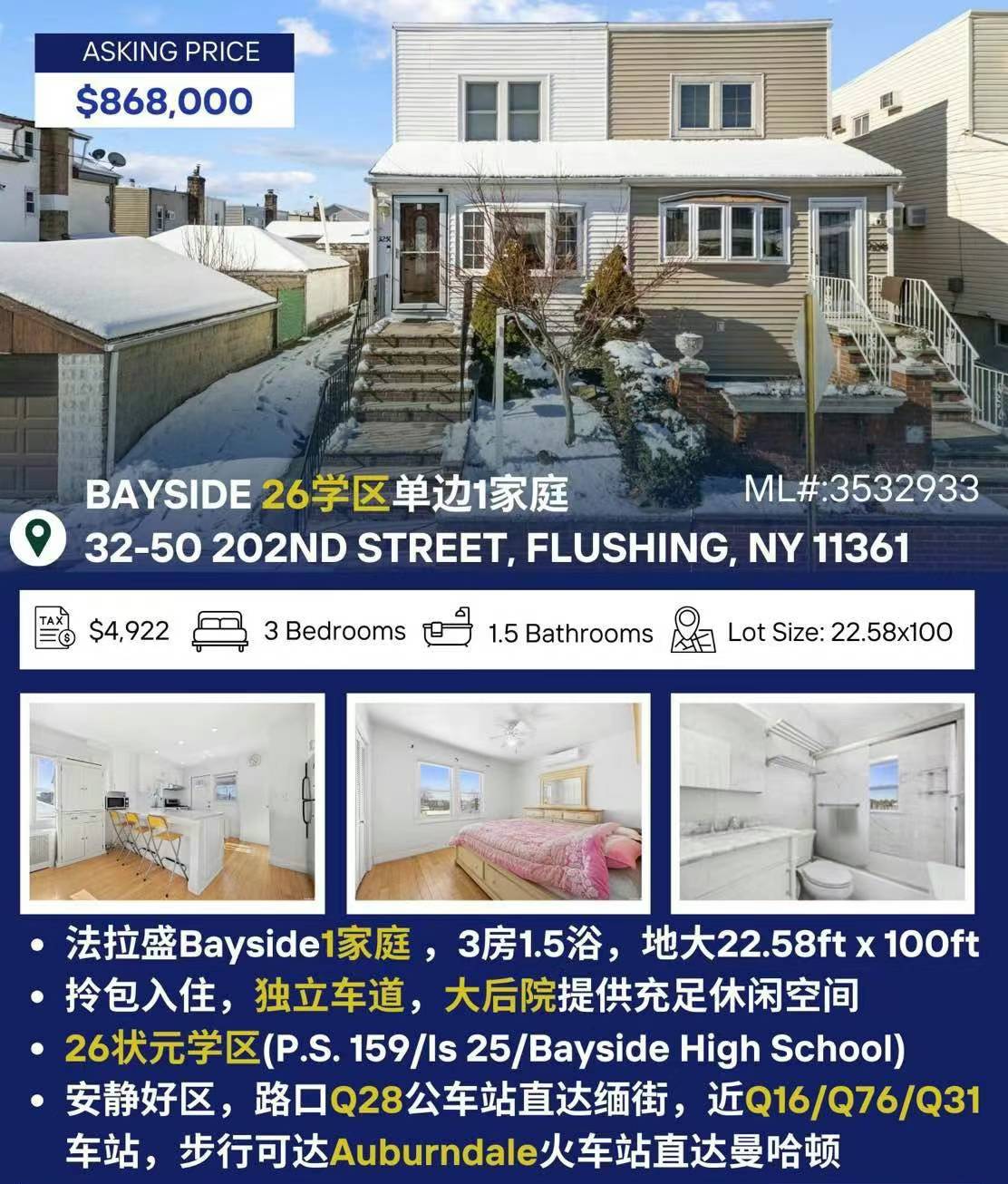 🔴屋况佳,拎包入住,状元学区(P.S. 159/Is 25/Bayside High School)