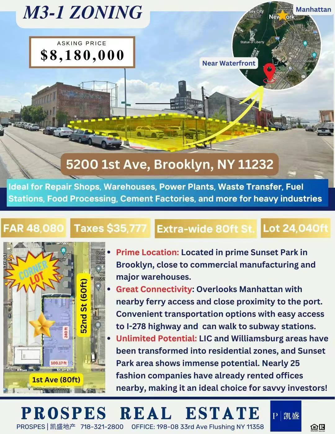 💎 M3-1 Zoning💎占地24,040尺;💎地税$35,777; 💎超宽80尺街道; 💎 FAR 48,080, 💎 Corner Lot