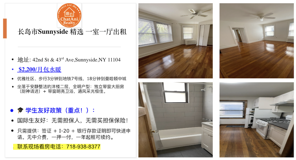 纽约长岛市 Sunnyside 优雅社区 | 整租一室一厅