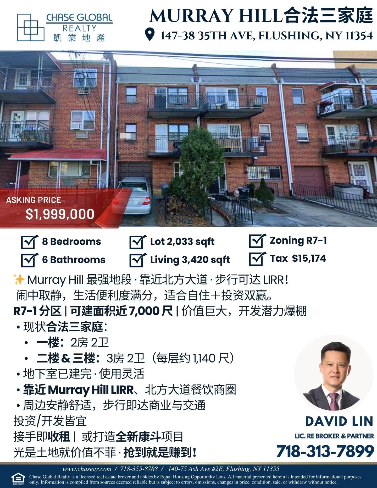 👏新上市独家代理,法拉盛最好地段最佳R7 -1 大面积663合法3 家庭仅售199.9万!