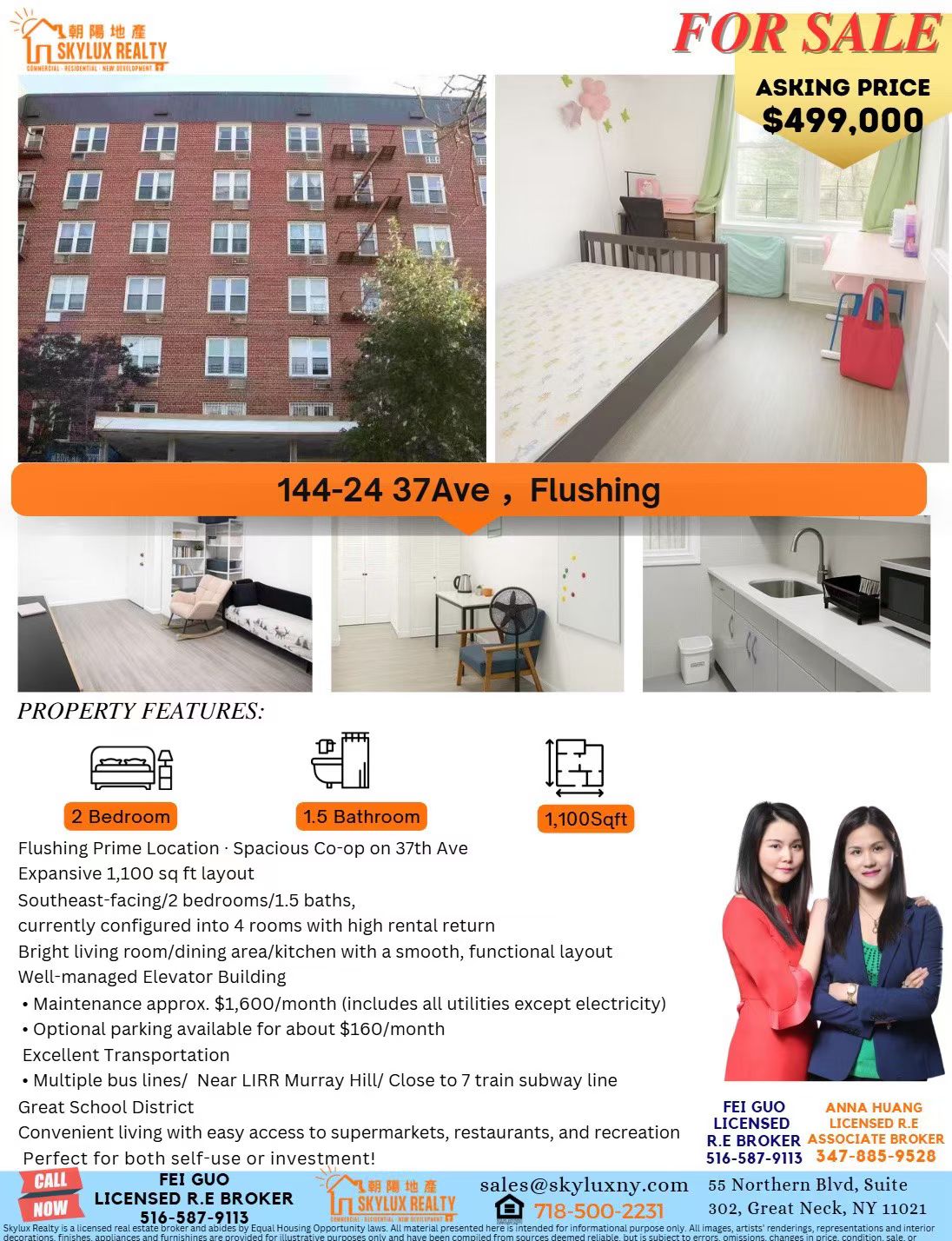 大樓管理完善,設有電梯,管理費約 1600/月,包含除電費以外的所有費用。另有車位可租,月租約 160、交通便捷,周邊多條公車路線環繞,鄰近LIRR Murray Hill 車站及7號地鐵 Main Street 樞紐,通勤十分便利。學區完整,有 P.S. 32 小學、JHS 189 初中及 Flushing 高中,附近亦有 Queens College 等高等學府。