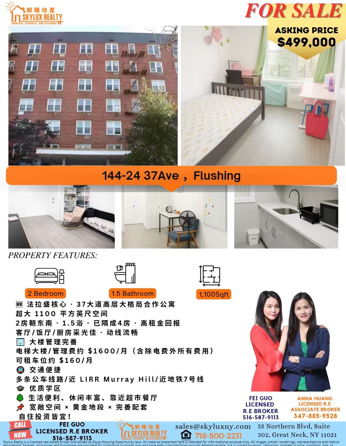 🆕法拉盛核心地段 37大道 高层合作公寓 拥有寬敞的 1100平方英尺 空間,設計合理,包含 2間臥室朝东南 和1.5間浴室。已是4个卧室 租金高、室內明亮的客廳、飯廳與廚房,居住動線流暢。大楼容易通过