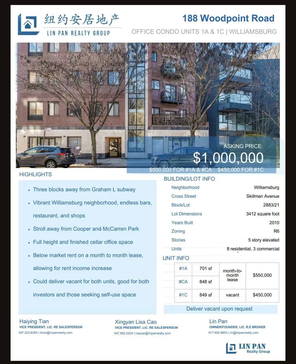 投资良机:布鲁克林East Williamsburg 商业物业community center。701尺街面+848尺地下室和 849尺街面。售价100万。预约看房,请电(347)223-6355。