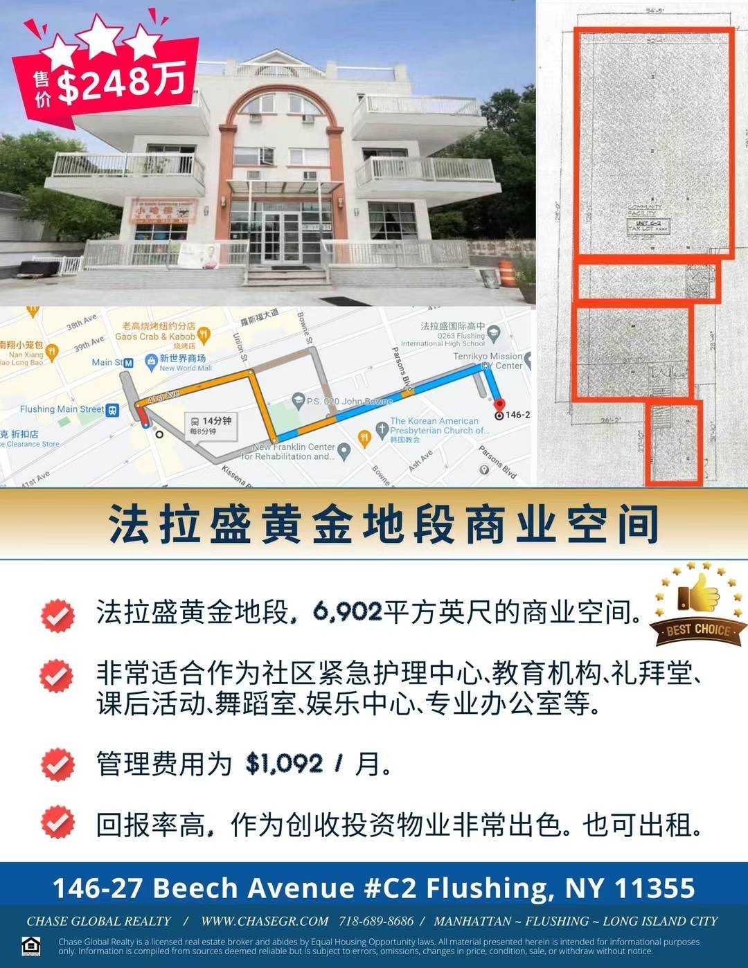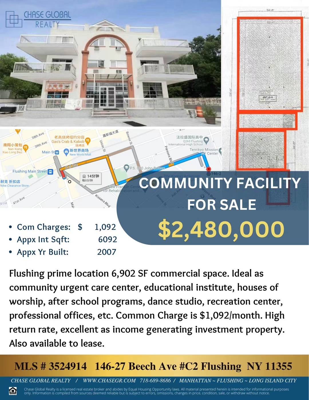 法拉盛中心缅街附近超大型商业楼可租可售 优越地理位置, 人/车流量大