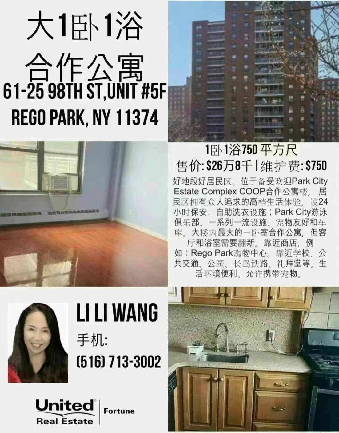 大1卧1浴合作公寓-好地段好居民区。位于备受欢迎Park City Estate Complex COOP合作公寓楼, 居民区拥有众人追求的高档生活体验,设24小时保安。自助洗衣设施;Park City游泳俱乐部、一系列一流设施、宠物友好和车库。大楼内最大的一卧室合作公寓,但客厅和浴室需要翻新。靠近商店,例如:Rego Park购物中心。靠近学校、公共交通、公园、长岛铁路、礼拜堂等。生活环境便利。允许携带宠物。售$26万8
