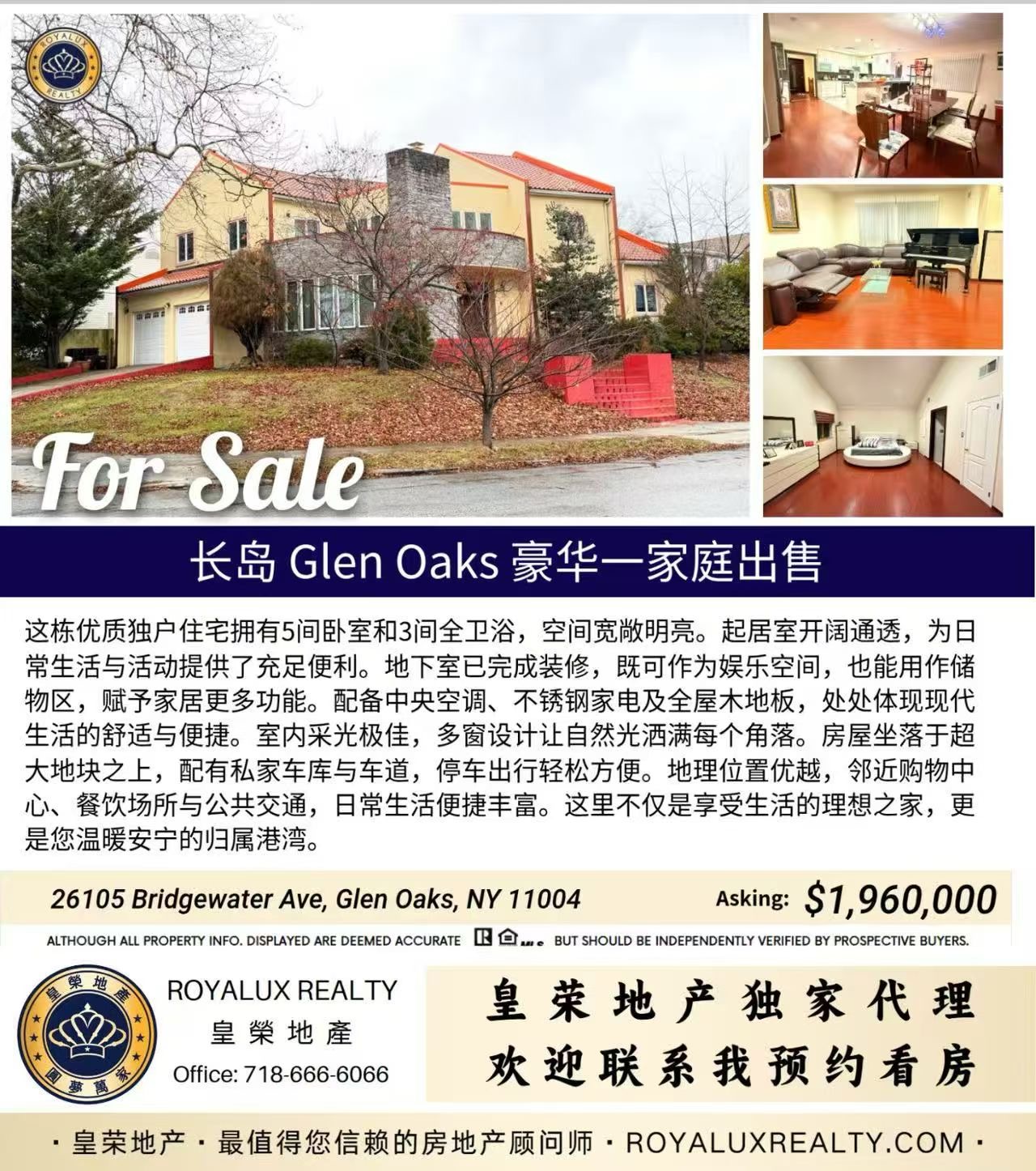 皇荣地产独家代理的Glen Oaks 高端住宅即将上市,这是一套现代风格的豪华独栋一家庭住宅,位于长岛黄金地段,周边生活便利、环境优雅,非常适合家庭自住或作为优质投资物业。