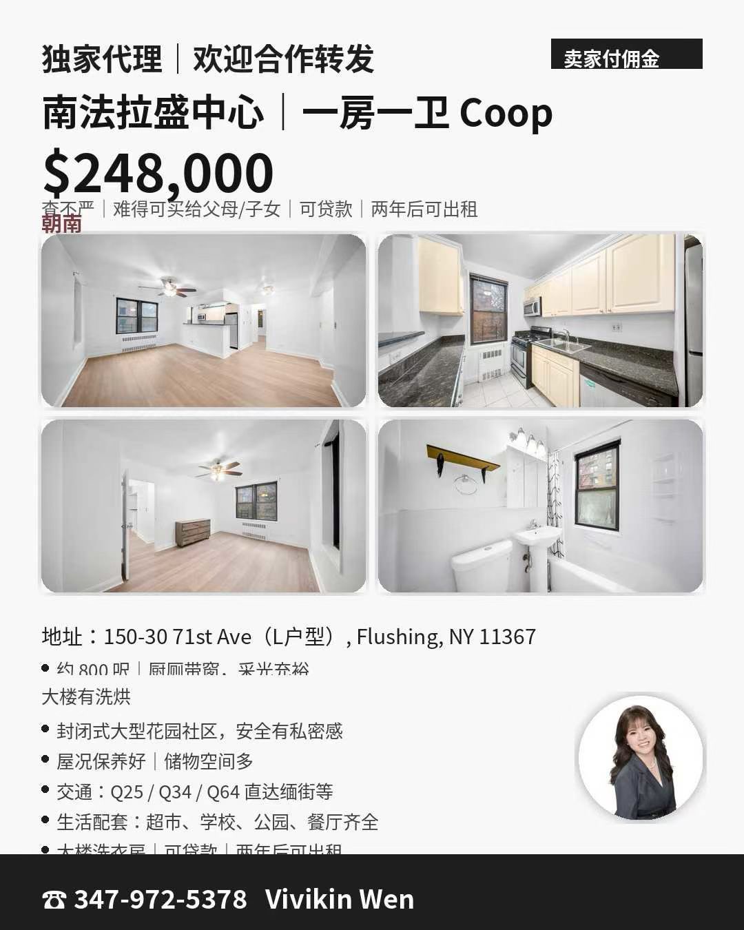 这套Coop公寓面积约800平方呎,户型为一房一卫,格局方正,采光充足。厨卫均带窗户,保证空气流通和自然光照。公寓维护良好,储物空间充足,满足日常生活及收纳需求。该公寓位于封闭式大型花园社区内,安全性高,适合家庭或单身人士居住。