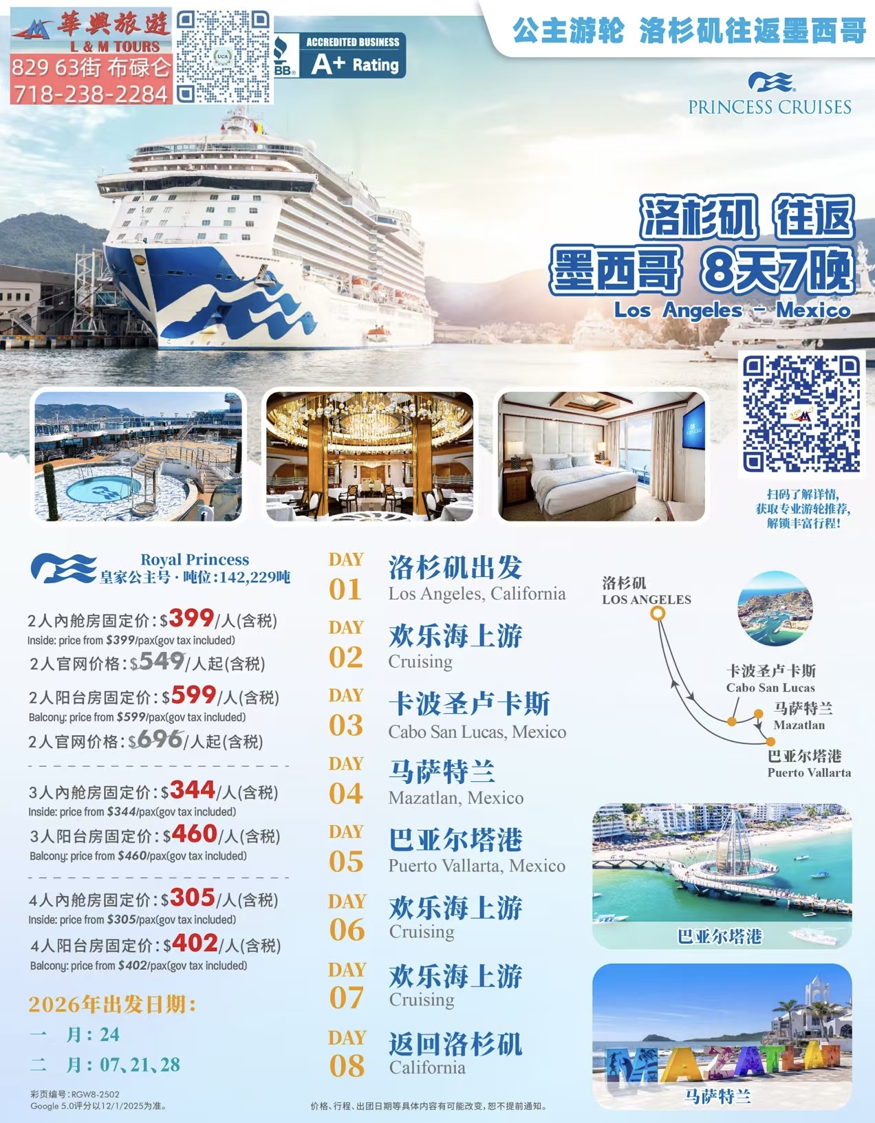 踏上 Royal Princess 皇家公主号(142,229吨),从洛杉矶出发,开启一场 8 天 7 晚的墨西哥海岸豪华巡航之旅。无论是家庭、情侣,还是好友小团体,这趟旅行都为你量身定制难忘体验。