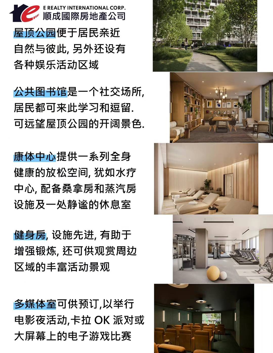 大楼为您打造绝佳舒适的居住环境!现代式建筑设计,完美格局户型!配有高端欧式家电, 地暖卫浴, 橡木地板,双层超强隔音落地窗,室内洗•烘机. The best amenities: 全方位服务的高奢社区, 设有空中花园, 景观露台, 烧烤区域, 健身房, 儿童游乐场, 蒸汽及桑拿水疗馆, 遛狗跑道, 瑜珈室,图书馆, 楼旁购物中心, 商场超市, 各式餐饮应有尽有!
