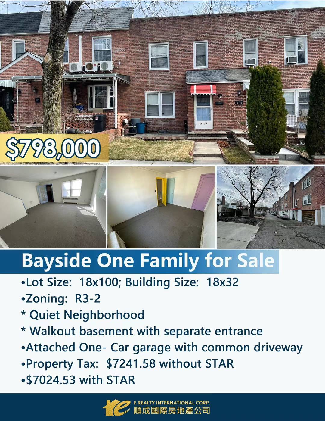 贝赛连栋一家庭出售:56-25 206 Street, Bayside, R3-2 zoning, 地:18x100, 屋:18x32, 已清空,二楼三卧一卫,一楼厨房饭厅 客厅,地下室后门平地出入,公用车道,售$79.8万,欢迎转发合作. 有意者請联系海欧718-397-9888