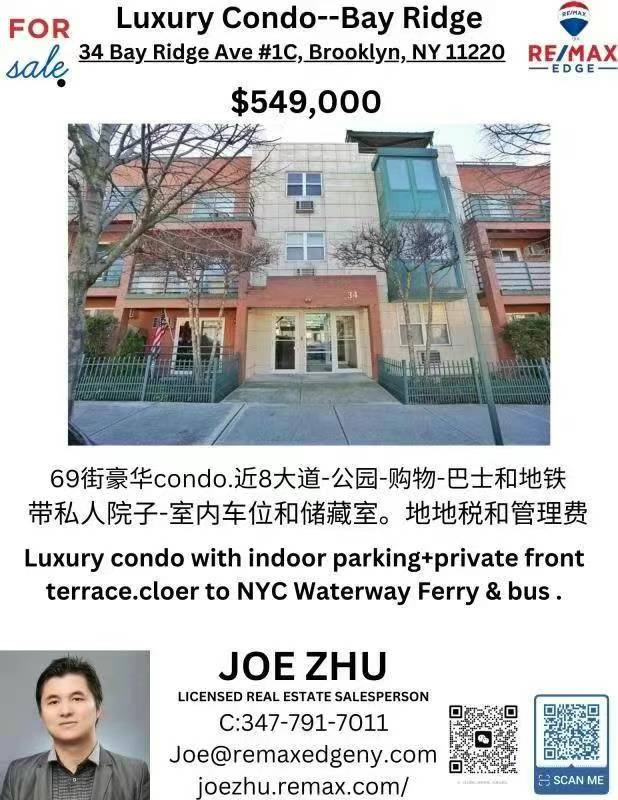 1房1厅1车库condo ,近8大道, 68街富人区,1房1厅1车位condo , 低管理费和地税,门口就是巴士站,一条街到公园,和码头。房东亏本贱卖,仅售54万9欢迎转发,买家经纪2% 347-791-7011