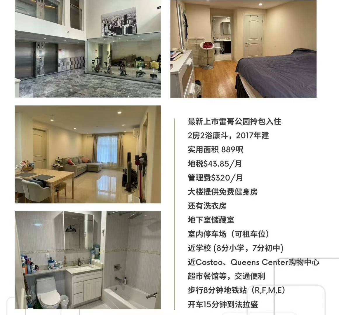 雷哥公园拎包入住2房2浴康斗,2017年建,实用面积889呎,地税$43.85/月,管理费$320/月,大楼提供免费健身房,还有洗衣房、地下室储藏室、室内停车场(可租或买车位),近学校(8分小学,7分初中),近Costco、Queens Center购物中心、超市餐馆等,交通便利,步行8分钟地铁站(R、F、M、E),步行4分钟LIRR长岛火车站,开车15分钟法拉盛。仅售$72万!