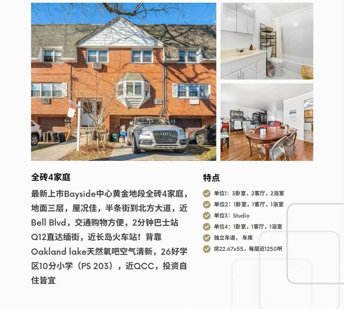 💖Bayside中心黄金地段全砖合法4⃣️家庭,地面三层,屋况佳,半条街到北方大道,近Bell Blvd,交通购物方便,2分钟巴士站Q12直达缅街,近长岛火车站!靠近Oakland lake,26好学区10分小学(PS 203),投资自住皆宜!房22.67x55,每层近1250呎!