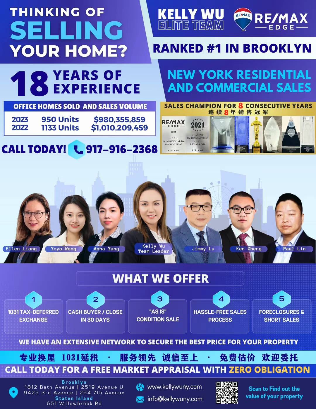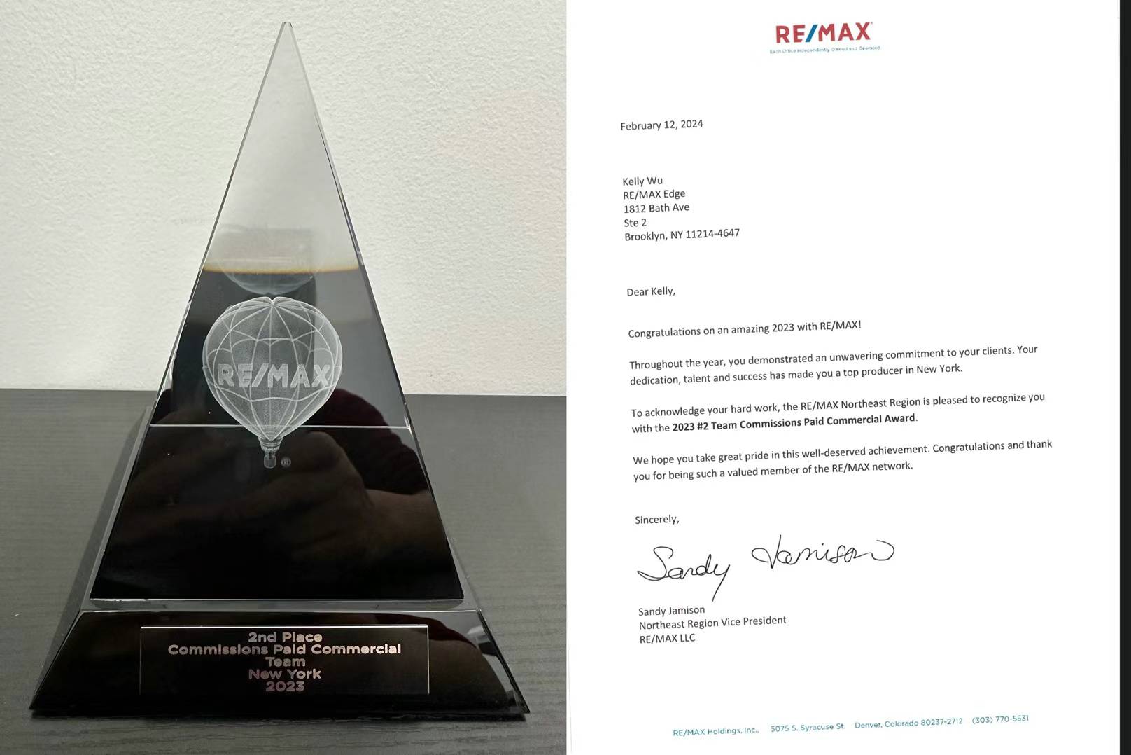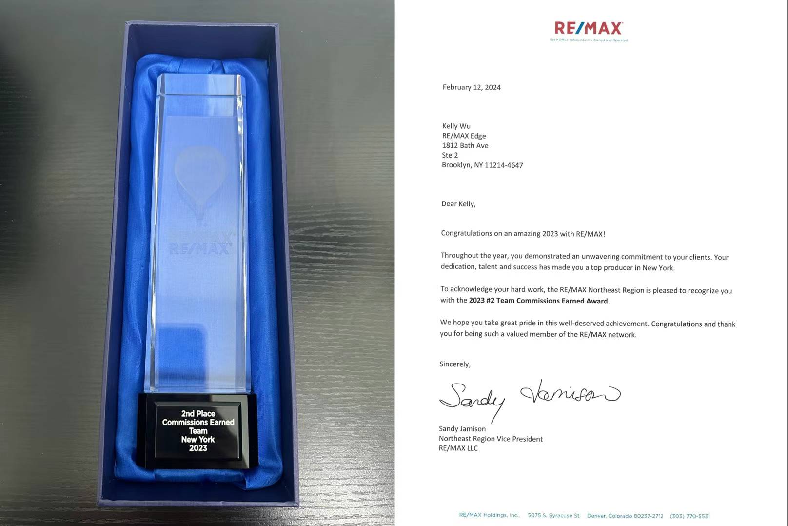 今天我们团队收到Remax总公司寄来的奖杯和奖牌,恭喜Anna Yang, Ken Zheng, Jimmy Lu. 你们的专业和才能得到肯定。同时也感谢你们对团队的付出和努力。让我们新建团队第一年就在纽约州排名第二。我们团队去年只有四个人,比起排名第一的团队十几人。我们每个人的业绩都遥遥领先。团队的胜利,不是一个人的功劳,而是大家抬着一起往前冲的结果。感谢你们,感谢时光,更加要感谢我们的每一位客户。今年我们团队增添了三位成员。团队同心,荣誉共赢,携手共进,我们会继续创造辉煌!