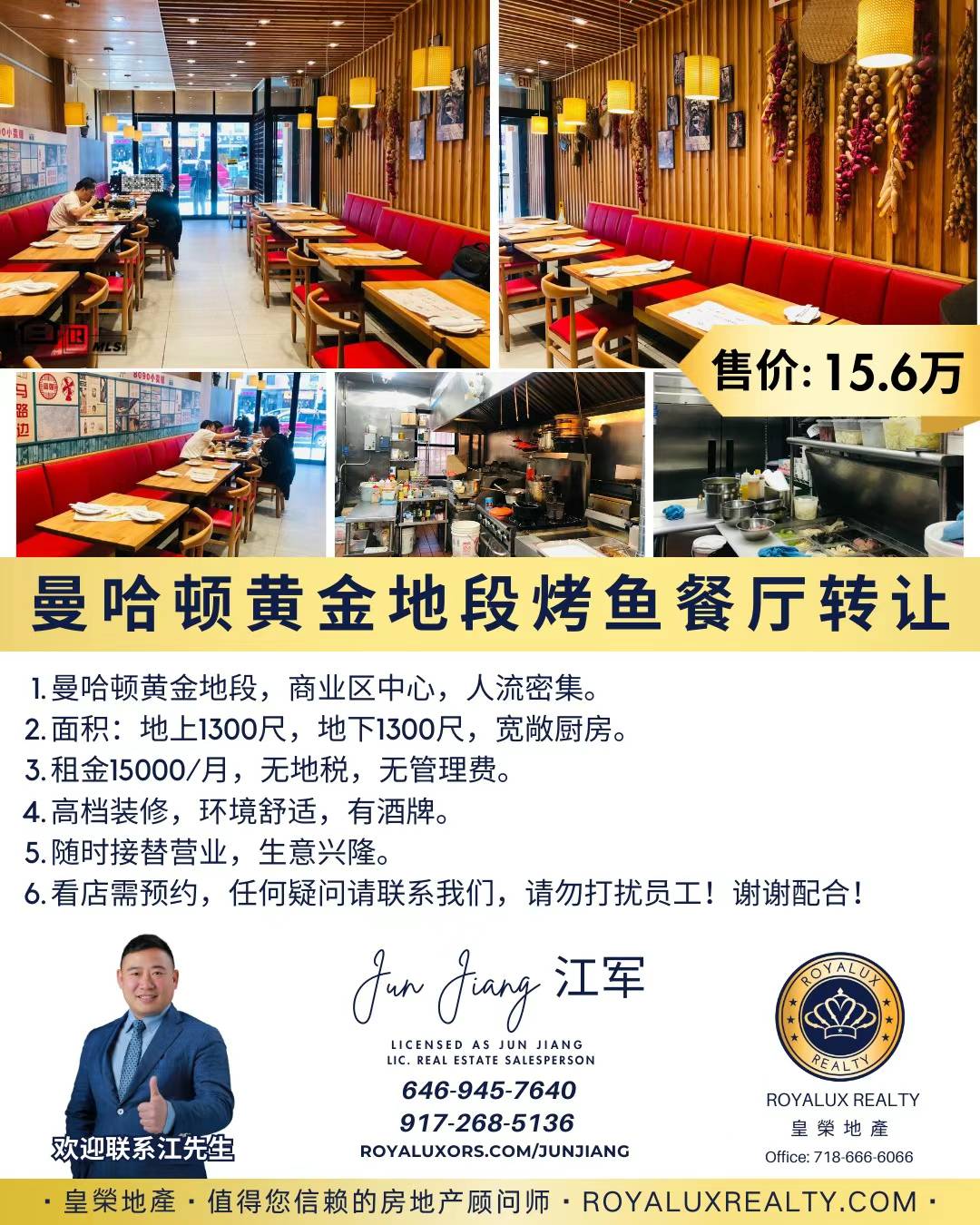 曼哈顿黄金地段烤鱼餐厅转让!售价15.6万!