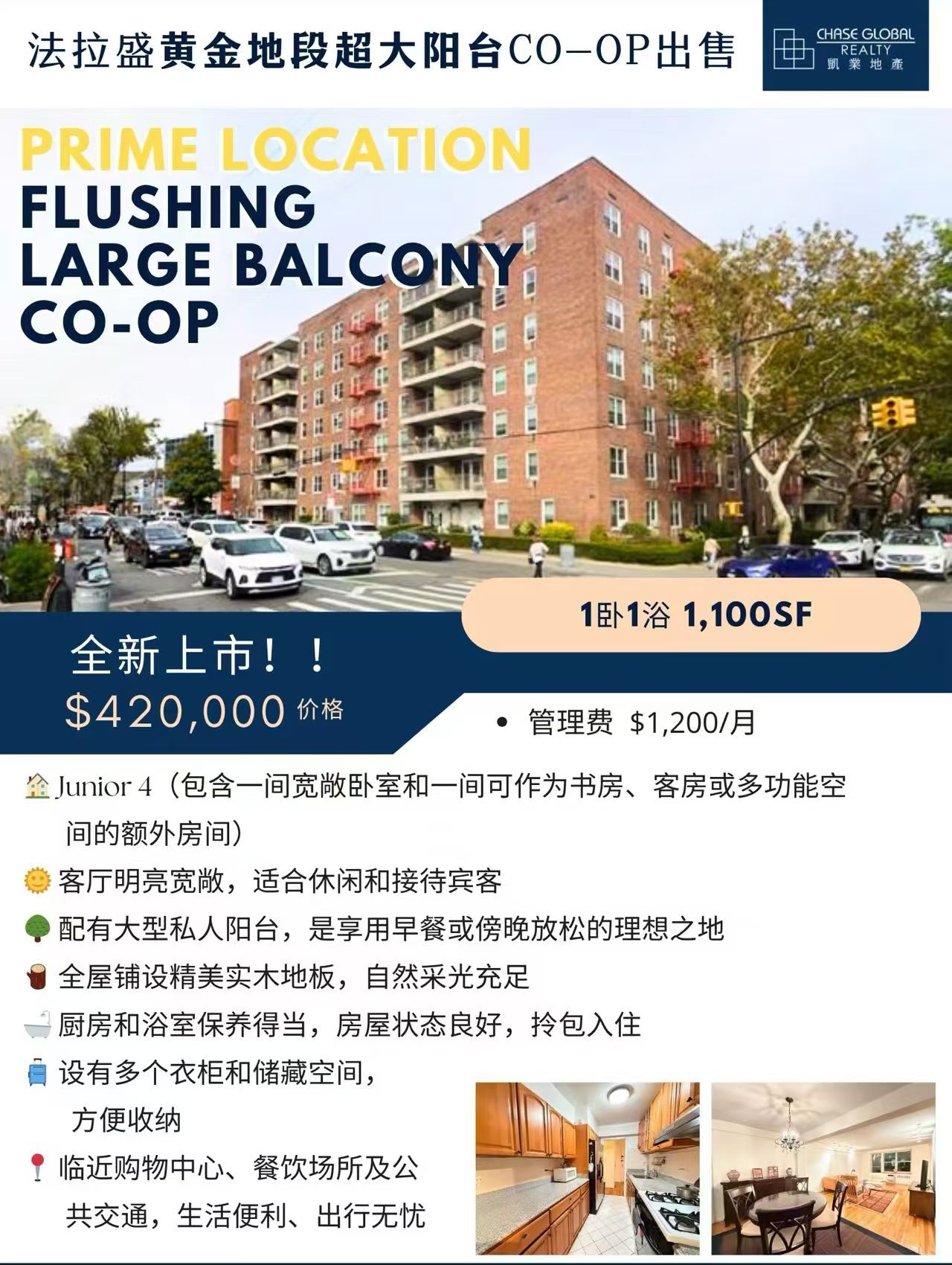 🔥凯业地产法拉盛黄金地段超大阳台Co-op公寓出售🔥