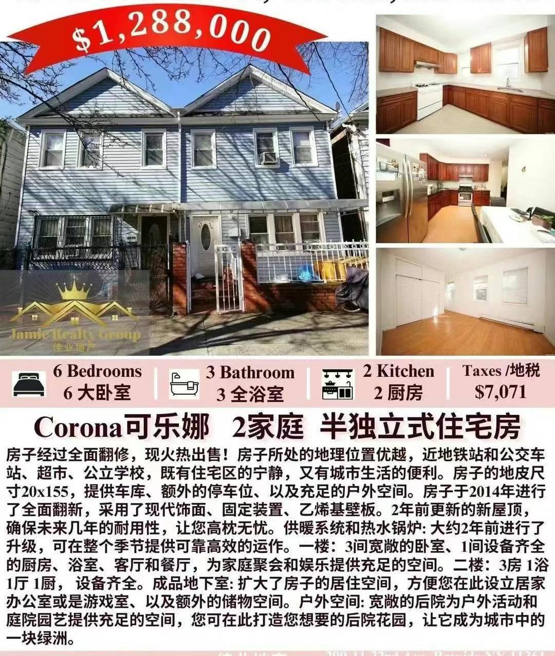 Corona 单边靠近公交车站、超市和公立学校。占地20x155,这处房产提供了充足的户外空间和2车位车库的奢华,另外还可轻松停放额外4辆车。新屋顶安装:享受内心的平静,屋顶2年前更换,全面翻新:2014年全面翻新,此家庭住宅已用现代化的饰面和装置更新,大约2年前,供暖系统和热水锅炉进行了升级,一楼设有三间宽敞的卧室、全套厨房、浴室、客厅和餐厅,二楼设有三间卧室、客厅、浴室和厨房。完成的地下室:完成的地下室,分开进出,位于步行距离内的必要设施和公共交通, 房子18x58, 地税$7071