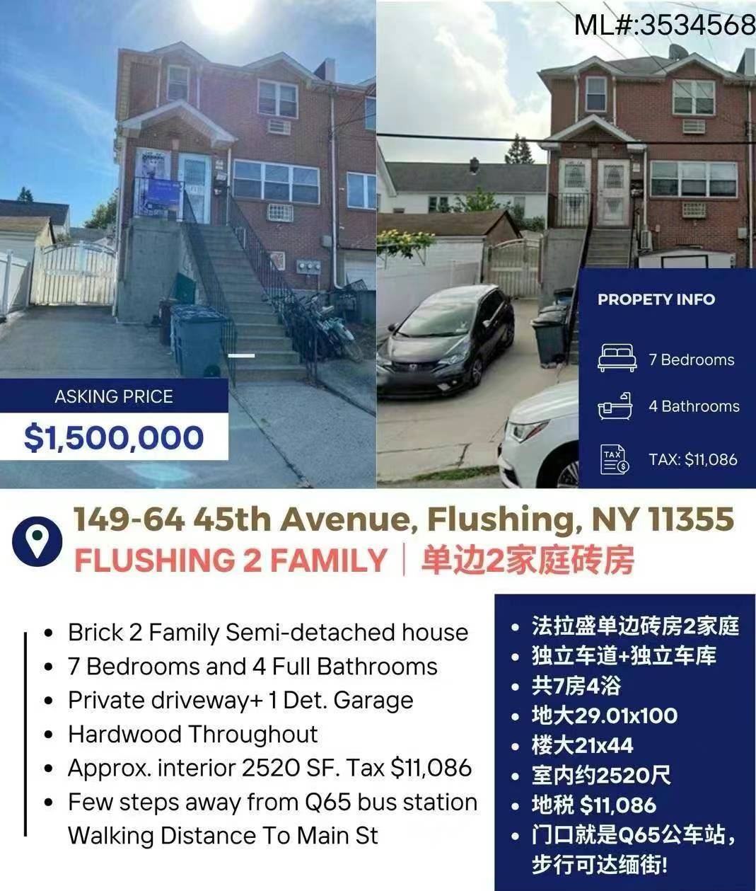 🌟法拉盛【单边砖房2家庭】出售🌟