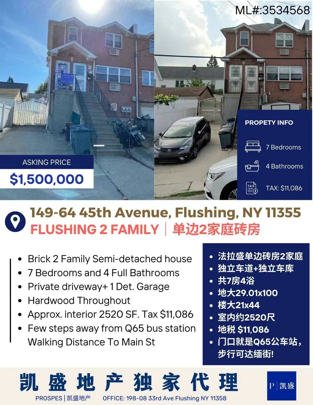 🌟法拉盛【单边砖房2家庭】出售🌟