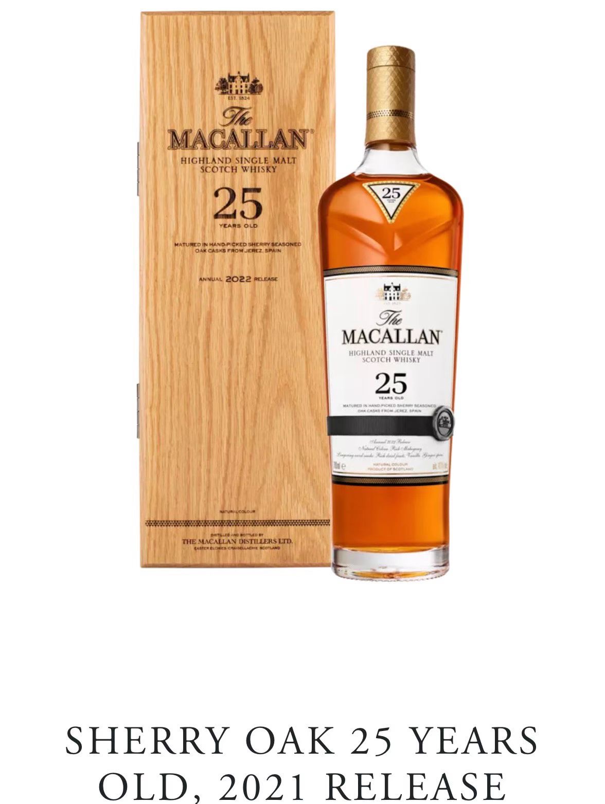 • Macallan 25年 雪莉桶 —— 高度陈酿,口感圆润复杂,酒体浓郁,收藏价值极高
