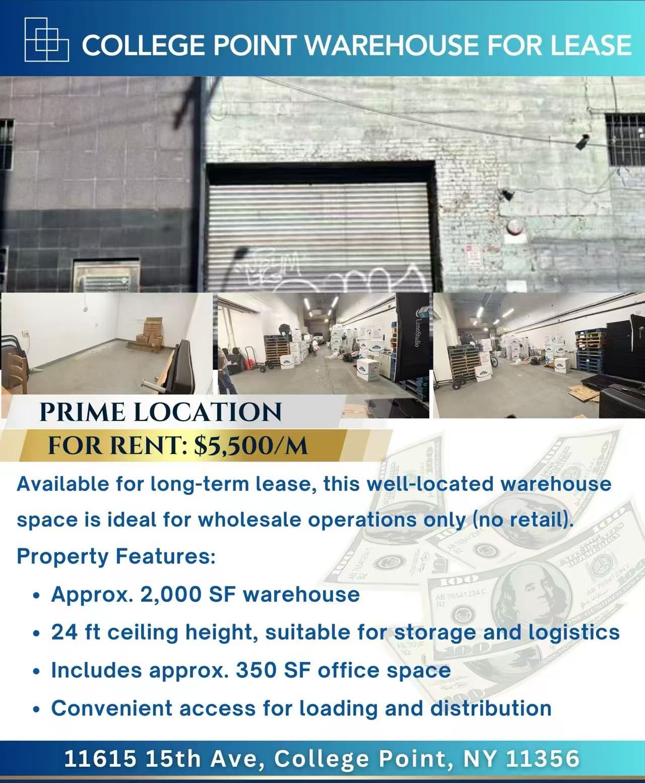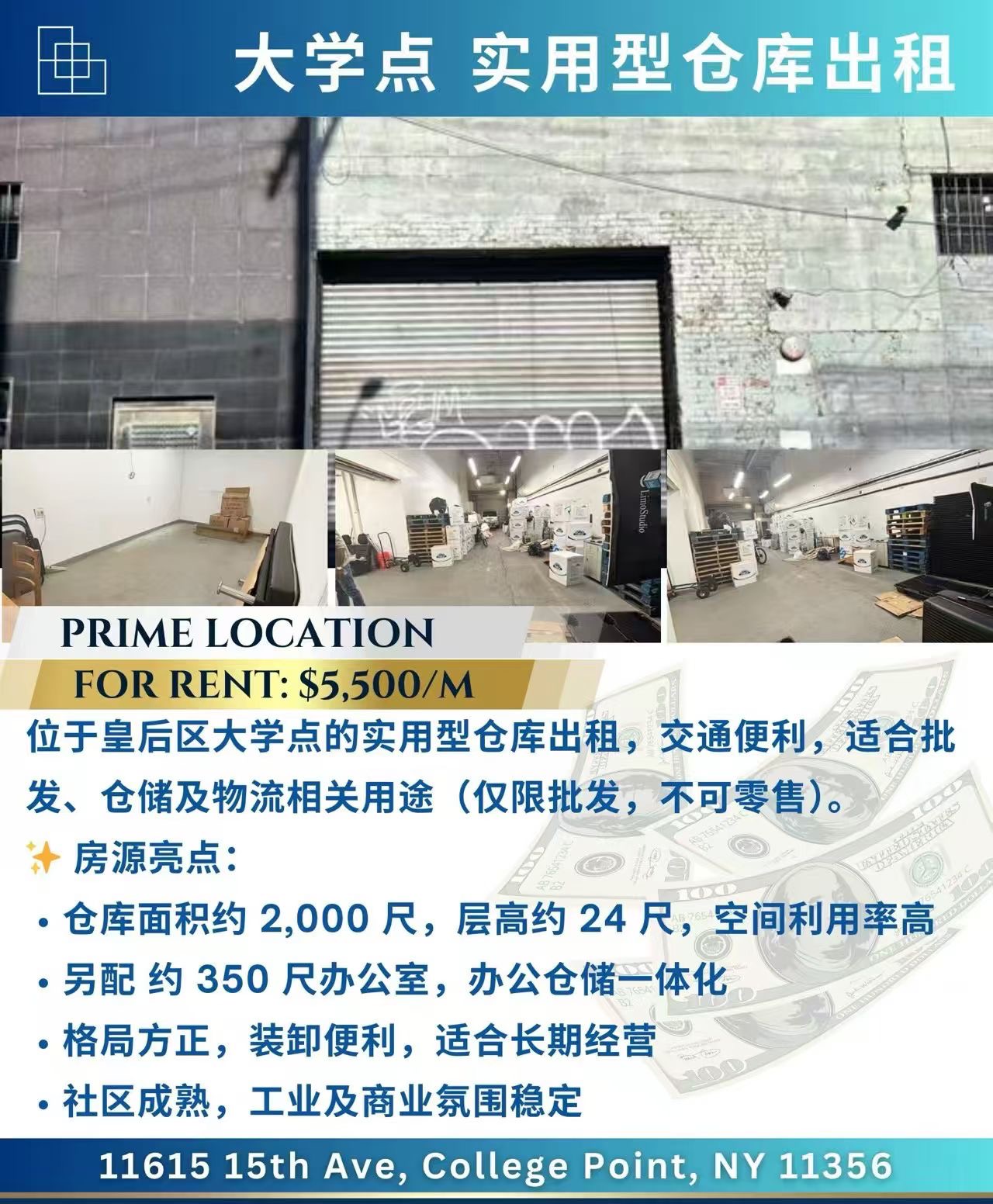 皇后区 College Point(大学点) 核心工业区的仓库现对外出租。该物业交通便利,靠近主要道路与物流通道,适合批发、仓储及物流相关业务使用(仅限批发,不可零售),为企业提供高效运营空间。