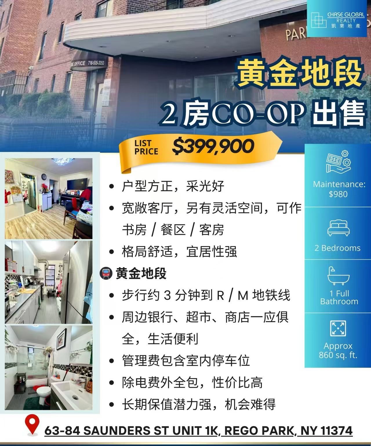 凯业地产最新上市!位于 Rego Park 核心社区 的两房一卫 Co-op,实用面积约 860 sqft,户型方正,采光充足,居住舒适,是 自住或投资的理想选择。