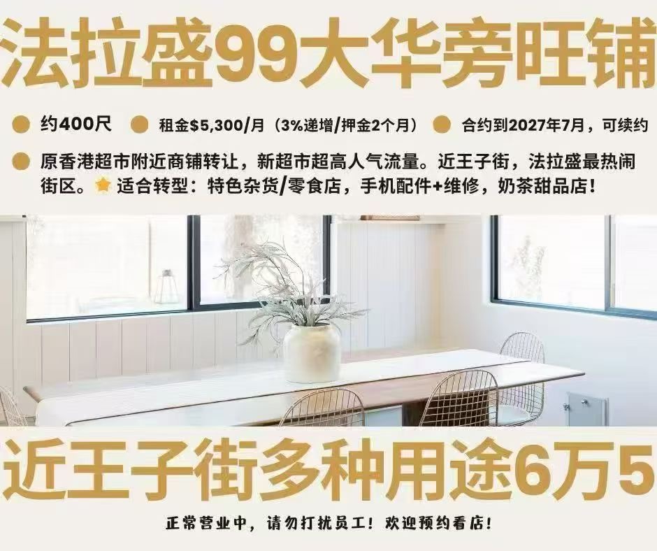 位于 法拉盛核心商圈,紧邻 新99大华超市和 王子街,人流密集、客群稳定,商业价值极高。周边住宅密集、交通便利,是创业者或投资者的理想选择。