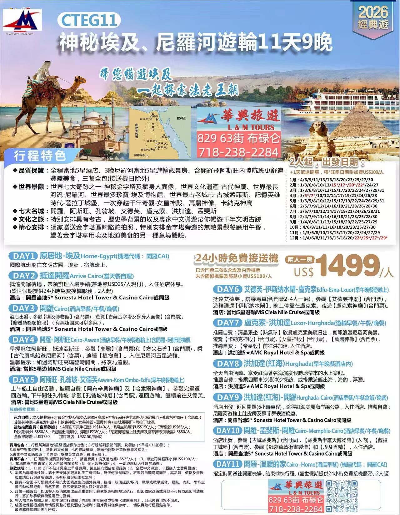 体验 埃及千年文明与尼罗河风情,全程 11 天 9 晚舒适行程,带您走进古老法老王朝的神秘世界。从开罗金字塔到卢克索神庙,再到阿斯旺大坝,每一站都是历史与文化的震撼体验。