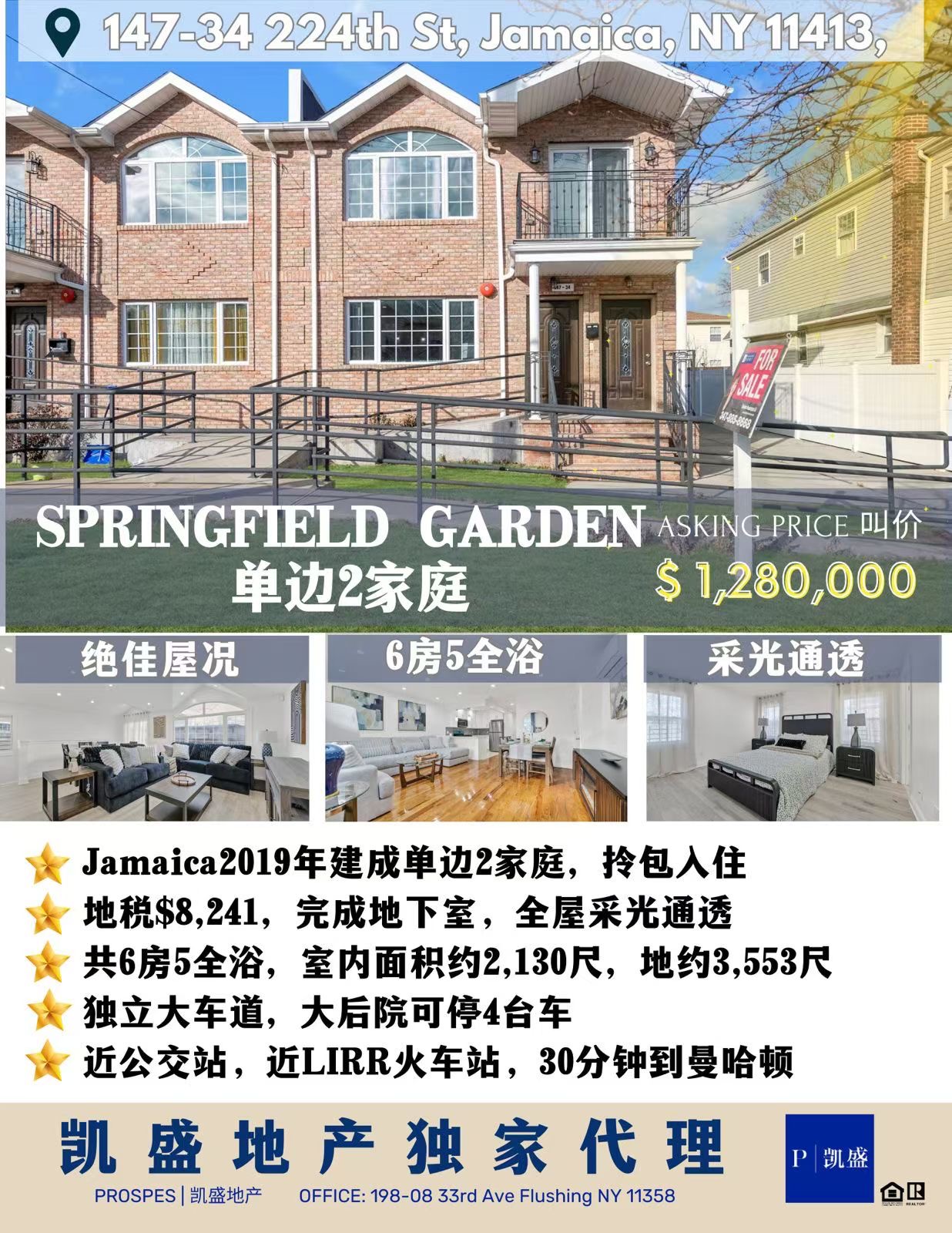 凯盛地产独家代理,全新上市!位于皇后区 Springfield Gardens 的阳光巨无霸两家庭独栋住宅,室内面积达 2,130平方尺,四面采光,挑高天花板与全屋大窗户设计让每个房间都充满自然光线,通透大气,是家庭自住或投资的绝佳选择。