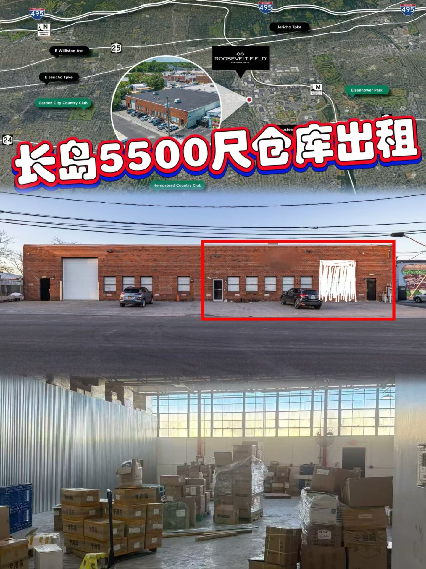 长岛黄金地段 Roosevelt Mall 附近 的仓库现对外出租,面积 5,500平方尺,层高 15尺,提供仓储与办公分隔空间,配备 Drive-In 装卸通道及充足电力,交通便利,适合多种商业用途。