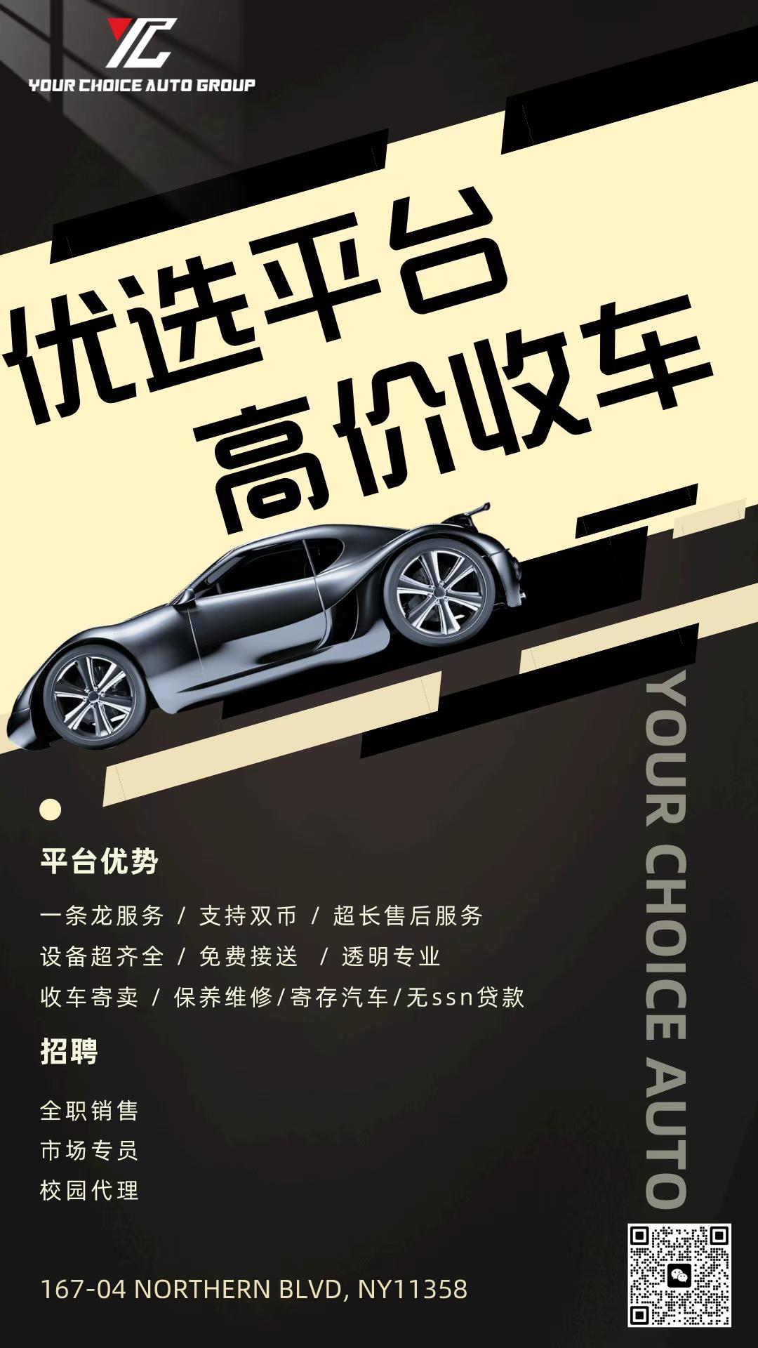 优选汽车 “独家”服务欢迎选择优选汽车,您的购车首选!我们以卓越的口碑、可靠的服务和专属的售后保障,让您购车无忧。以下是我们的服务亮点:全面的售前服务专业服务:无论您是留学生、信用不佳的客户,还是TLC出租车司机,我们都能为您提供专业的购车建议和服务。丰富经验:我们拥有超过20年的销售经验,致力于为每位客户找到最合适的车辆,并争取最大的优惠。透明交易:绝无隐藏费用,保证每一位客户都能享受到最高质量的汽车。我们的资深验车师傅会使用最先进的仪器检验汽车质量,并提供Carfax报告。