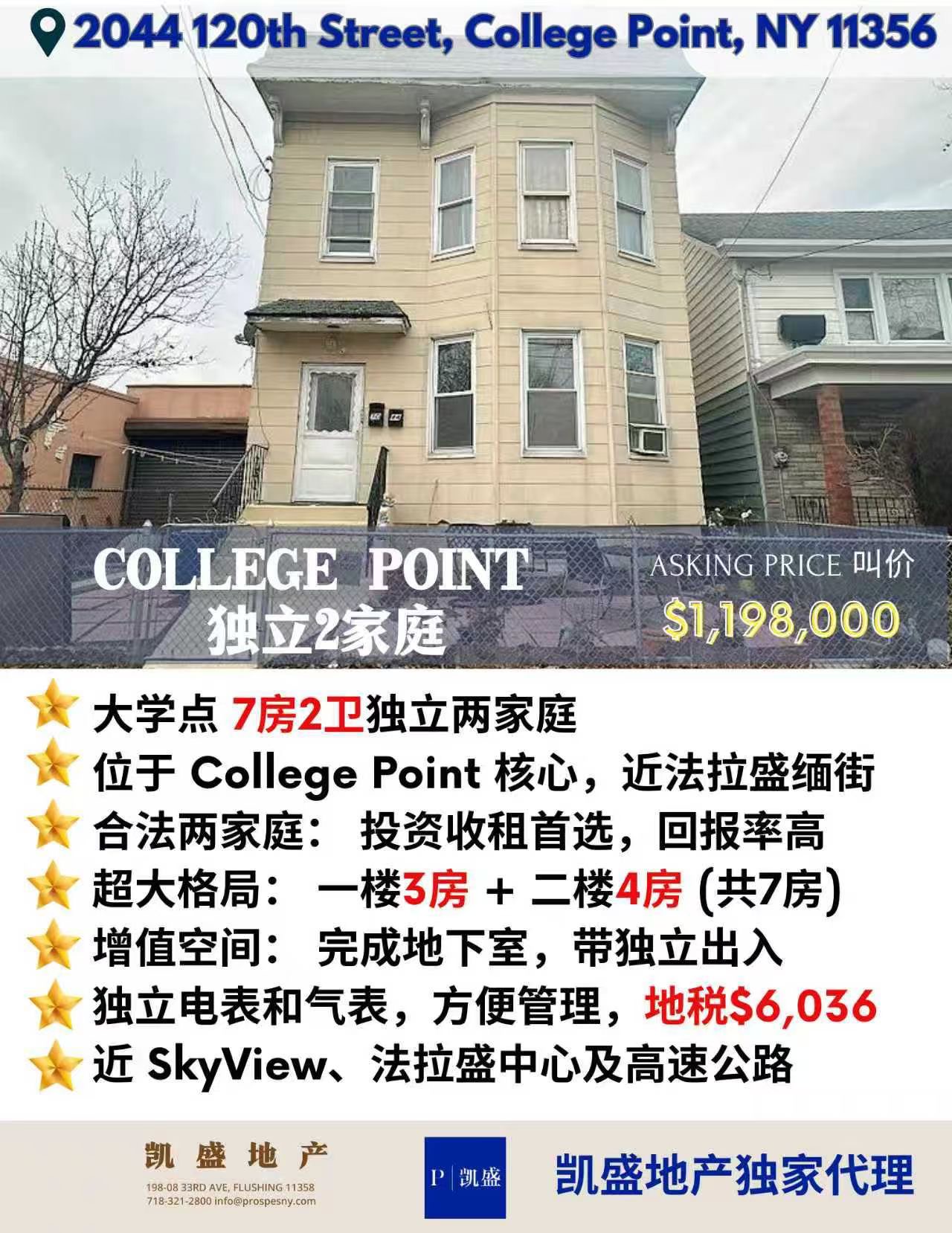 College Point 核心区合法两家庭住宅,格局合理、设施完善、投资回报高,地下室增值潜力大,是自住或投资收租的理想选择。机不可失,立即行动!