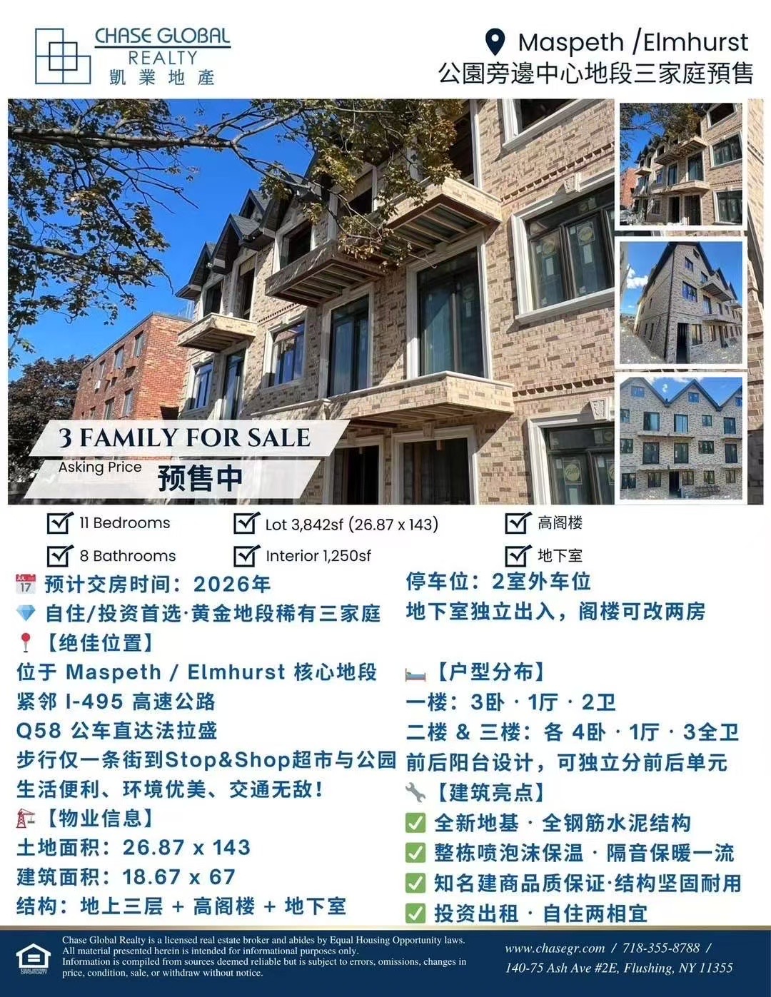 这套 Maspeth/Elmhurst 预售三家庭兼具 地段优势、建筑质量、灵活户型、高投资回报、未来升值潜力等多项优势,无论是自住还是投资都是理想之选。