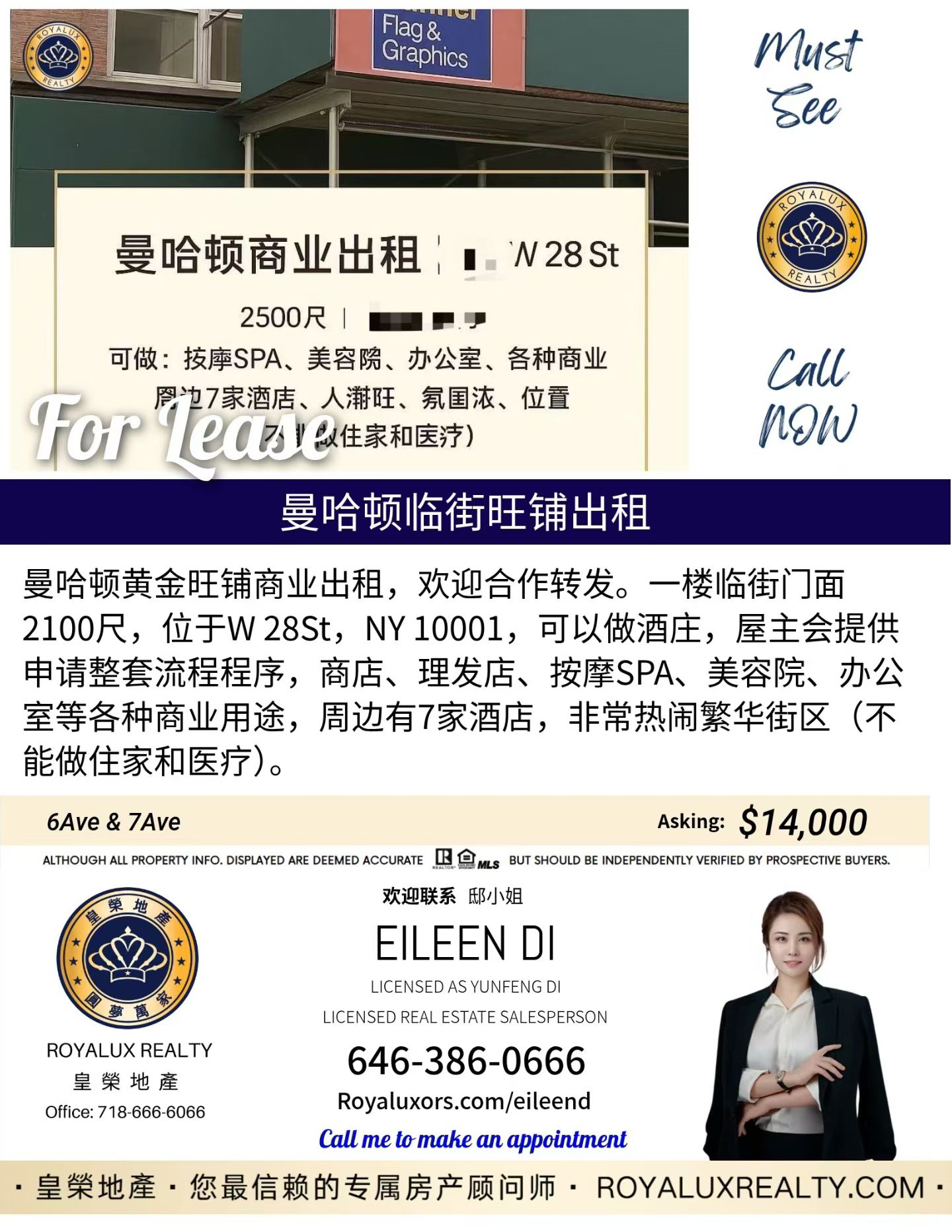 曼哈顿黄金旺铺出租|一楼临街 2100尺 热闹商圈