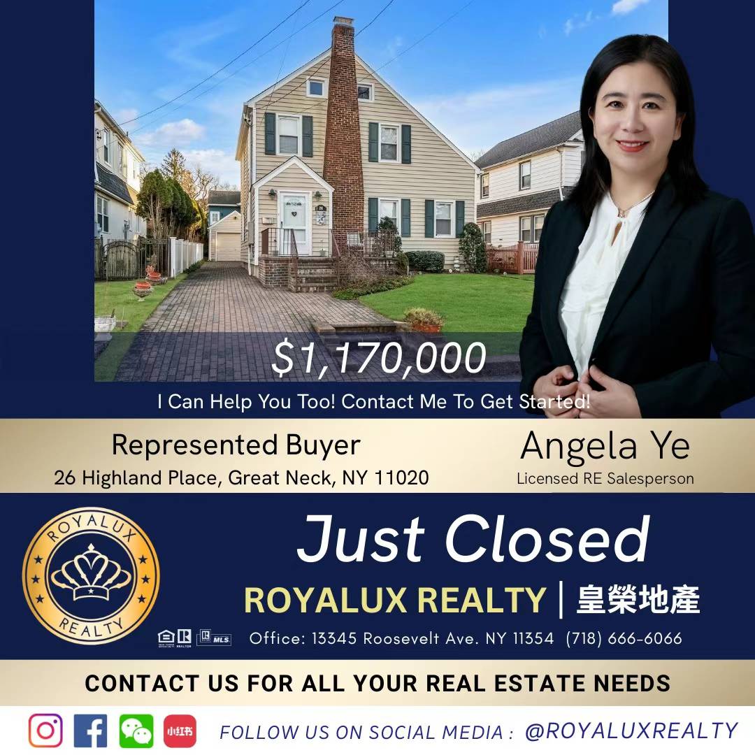 🎊恭喜皇荣地产精英 Angela Ye 又成功过户新的一单买卖!皇荣地产诚聘经纪!皇荣地产提供经纪:纽约最好的佣金制度、纽约最好的品牌营造、纽约最好的培训辅导、纽约最好的高效做单系统!