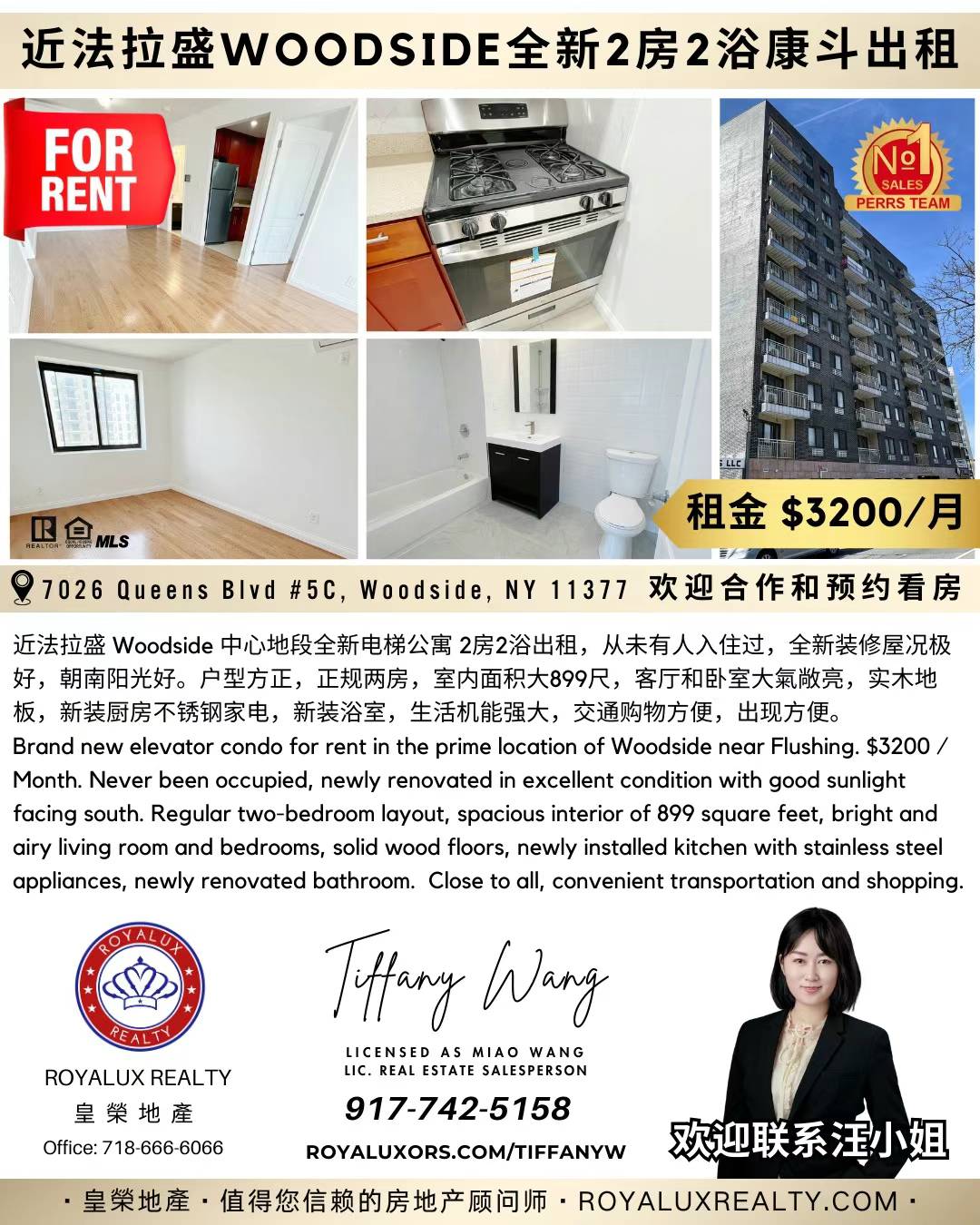🔥康斗介绍:近拉法盛 Woodside 中心地全段新电梯公寓 2房2浴出租,从有未人入住过,全装新修屋况极好,朝阳南光好。户型方正,正两规房,室面内积大899尺,客和厅卧室大敞氣亮,实地木板,新厨装房不钢锈家电,新浴装室,生机活能强大,交购通物方便,出方现便。$3200/月。