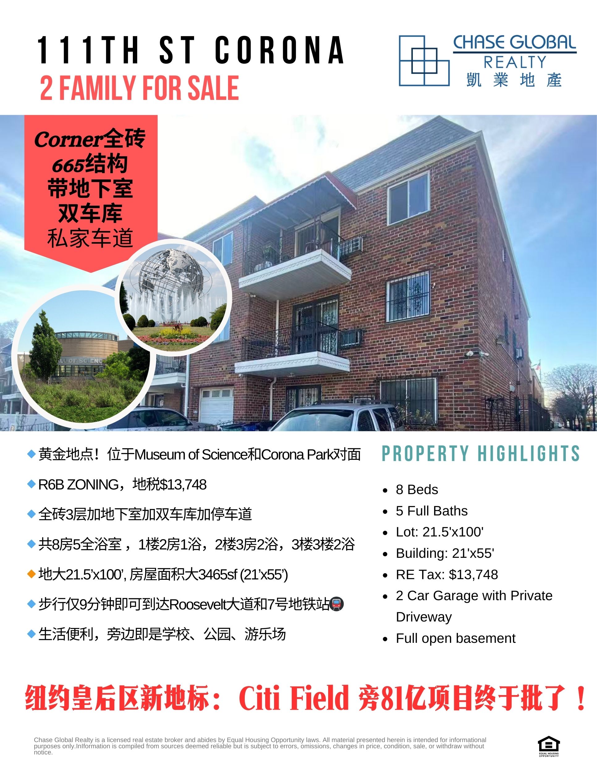 🔹黄金地点!位于Museum of Science和Corona Park对面