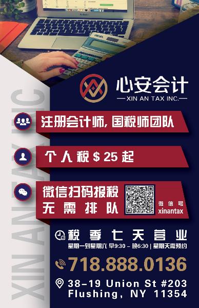 联系 法拉盛 心安会计师事务所 (Xin An Accountant & Tax Return Flushing) , 获取专业咨询!