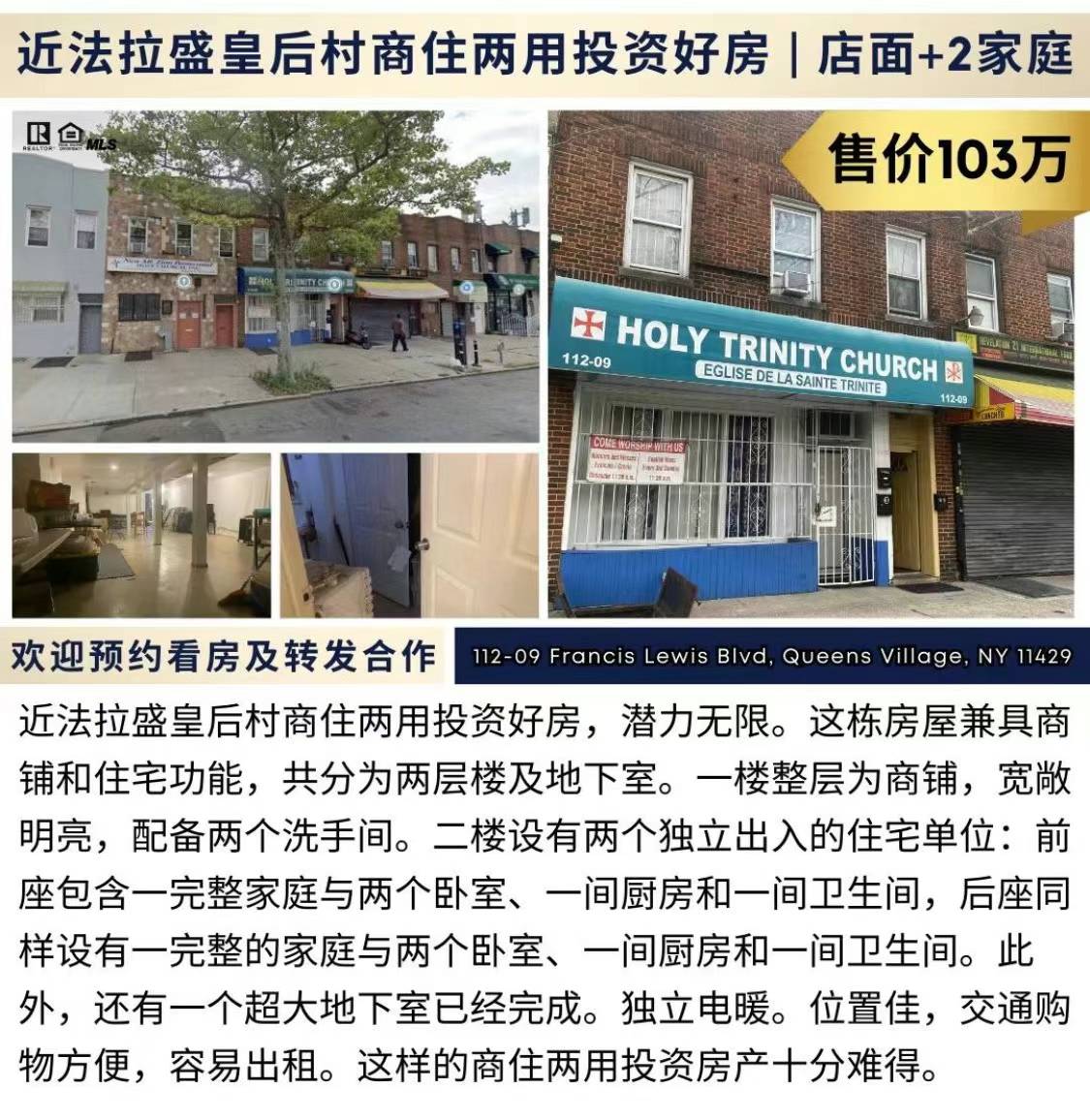 近法拉盛皇后村商住两用投资🌟店面+2家庭砖房